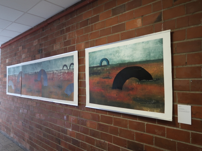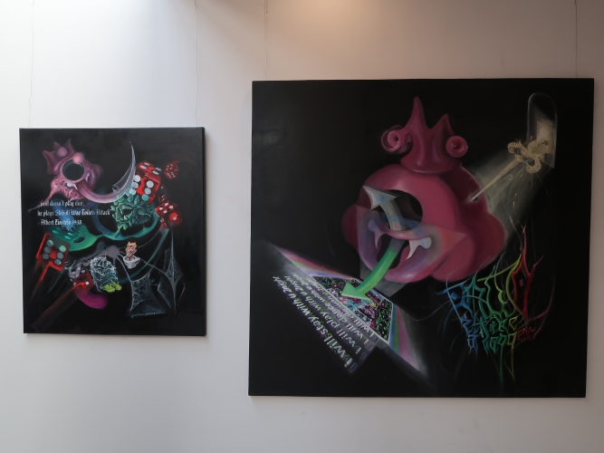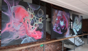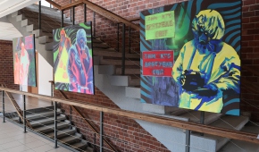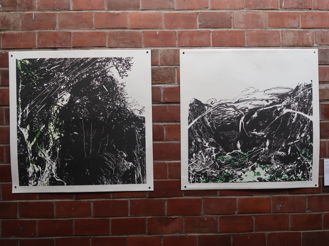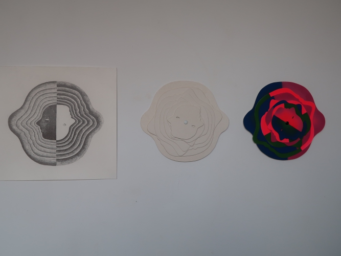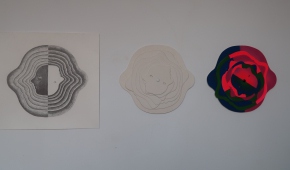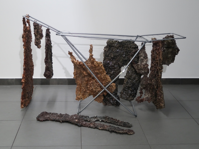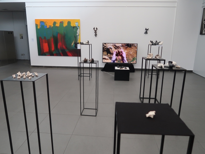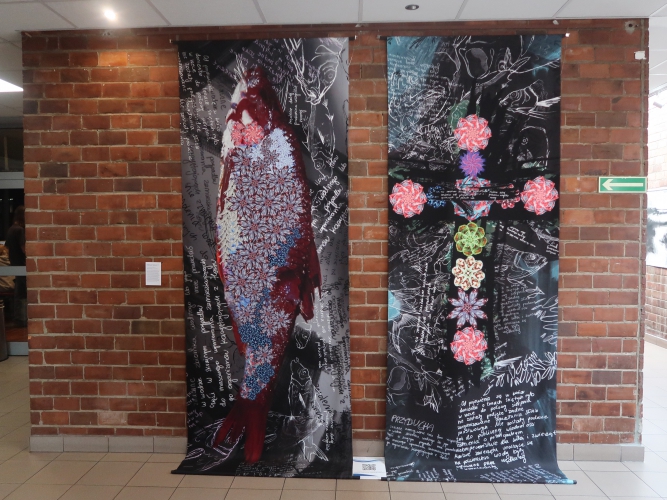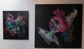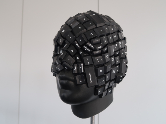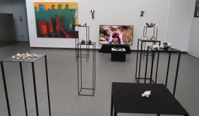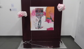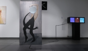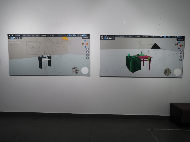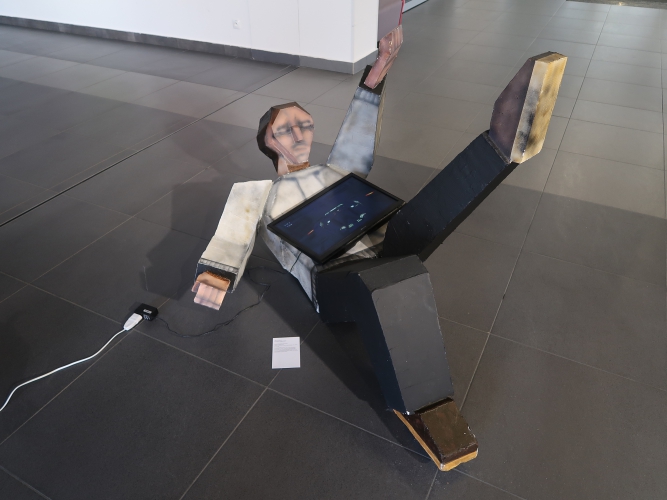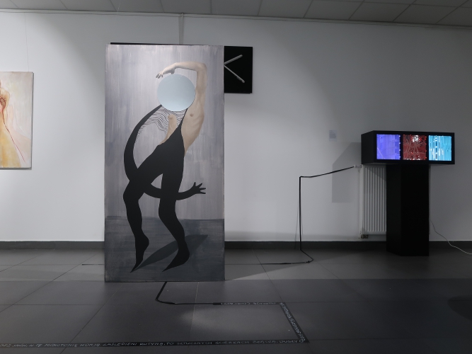 Aleksandra Gąsiorowska zwraca uwagę na relacje wirtualnej technologii z rzeczywistością, z elementem ludzkim. Jej „Malarstwo cyfrowe” to namalowany ręcznie proces tworzenia modeli 3D w programie komputerowym. Jak pisze: „Modele przedstawione na obrazie mają przedstawiać przedmioty malowane ręcznie, natomiast obraz ma naśladować sztucznie stworzony obraz z monitora komputerowego”. Natalia Biernat w trzech małych rzeźbach głów z odzyskanego plastiku i rdzewiejącego metalu obrazuje proces „cyborgowacenia społeczeństwa” – czarne głowy szczelnie oplatają czarne klawiatury komputera, tworząc z nimi jedność.