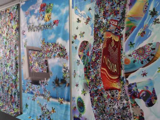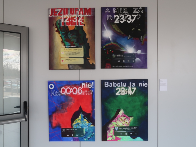 Kilka osób pokazało prace, w których wyjęte z kontekstu elementy cyfrowej rzeczywistości – agresywne bodźce wizualne – nakładają się na siebie, tworząc jaskrawo kolorową przestrzeń chaosu, z której niełatwo wyłowić wzrokiem konkretne kształty czy komunikaty. Autorka jednej z takich propozycji, Julia Burak, ujęła to w opisie swojego projektu tak: „Kolorystyka i kompozycje oddają euforię internetowego zanurzenia, ale jednocześnie skłaniają do refleksji – czy kontrolujemy naszą obecność online, czy raczej to internet pochłania nas?”. Poczucie wchłonięcia, nadmiaru, przebodźcowanie, kłopot z odróżnianiem prawdy od fake newsa i bezradność w tym wszystkim to problemy współczesnego człowieka, które przecież tylko się pogłębią wraz z rozwojem sztucznej inteligencji.