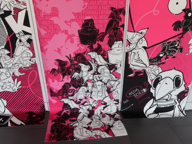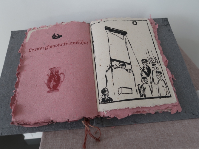 Jakby w ucieczce przed inwazją wielobarwnego zamętu powstał animowany czarno-biały (a w zasadzie wyblakły szary) „komiks” Zofii Muzolf o elfie i gnomie – bez chmurek, z postaciami, które mówią głosami. I jeszcze wiele innych prac, w tym niezwykle subtelne, niepozorne grafiki Jakuba Kwiatkowskiego z serii „Miraże”, w których na czarnym tle delikatna linia buduje dyskretne formy – to odbicia wspomnień miejsc i budynków, przefiltrowane przez emocje autora. Żeby je dojrzeć (i docenić), trzeba przysunąć wzrok bardzo blisko, wejść z pracą w intymny kontakt. To odwrotność sztuki komercyjnej, działanie skupione na samym tworzeniu, w buddyjskim spokoju, który udziela się odbiorcy. Ten sam autor wykonał interesującą książkę artystyczną z autorskimi wierszami i ilustracjami, która jest krytyką rzeczywistości, a wieńczy ją graficzny taniec śmierci.