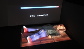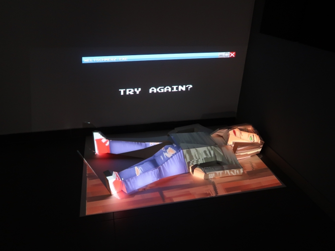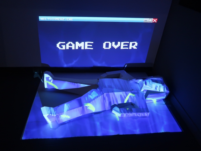 Młodzi artyści czerpią z estetyki cyfrowych komunikatów wizualnych – współczesnych i tych sprzed lat, gdy komputer kojarzył się z niewinną rozrywką. Choć i ta niewinność była zwodnicza – świetnie obrazują to dwie rzeźby pozostające w klimacie dawnych gier komputerowych: „kwadratowe” postaci ludzkie leżą na ziemi, powalone, ale wciąż podłączone do komputera. „Game over” – słychać, gdy widz zbliży się do tej autorstwa Macieja Zielińskiego (laureata nagrody „Kalejdoskopu” w studenckim konkursie sprzed roku). W drugiej rzeźbie - "Weltschmerz" Wiktorii Głowackiej - postać zmienia stan: raz żarzy się, jakby płonęła od wewnątrz, raz „tonie” w wodzie, a przerywnikiem w tym cyklu cierpień jest wizualny sygnał zakłócenia, śnieżenie. Tylko gra komputerowa może zapewnić takie doznania, jak wielokrotna śmierć i nieustanne zmartwychwstawanie. „Game over” na zmianę z „Try again?”. Życie po życiu, po życiu, po życiu…