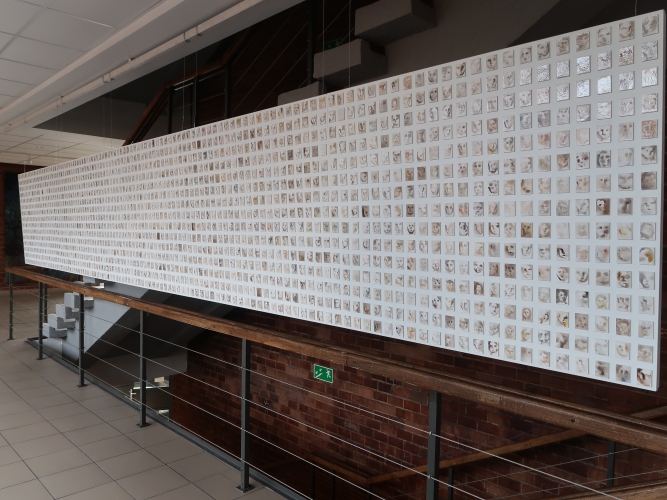 Wiktoria Kacprzak poprzez dużą mozaikę z 1650 prostokącików z niewyraźnymi twarzami opowiada o dramacie Strefy Gazy – to „zdjęcia” ludzi, którzy zginęli tam w wyniku działań wojennych Izraela w ciągu ostatniego roku. W masie te śmierci wydają się bez znaczenia…