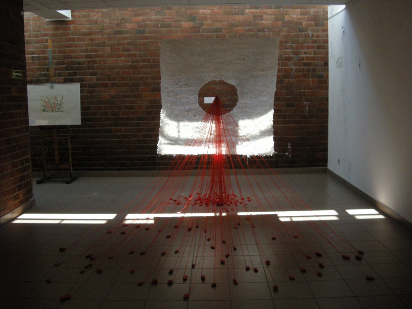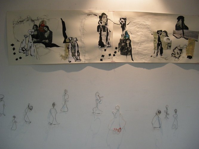 układanymi z nitki liniami. Dużemu kolażowemu fryzowi towarzyszą