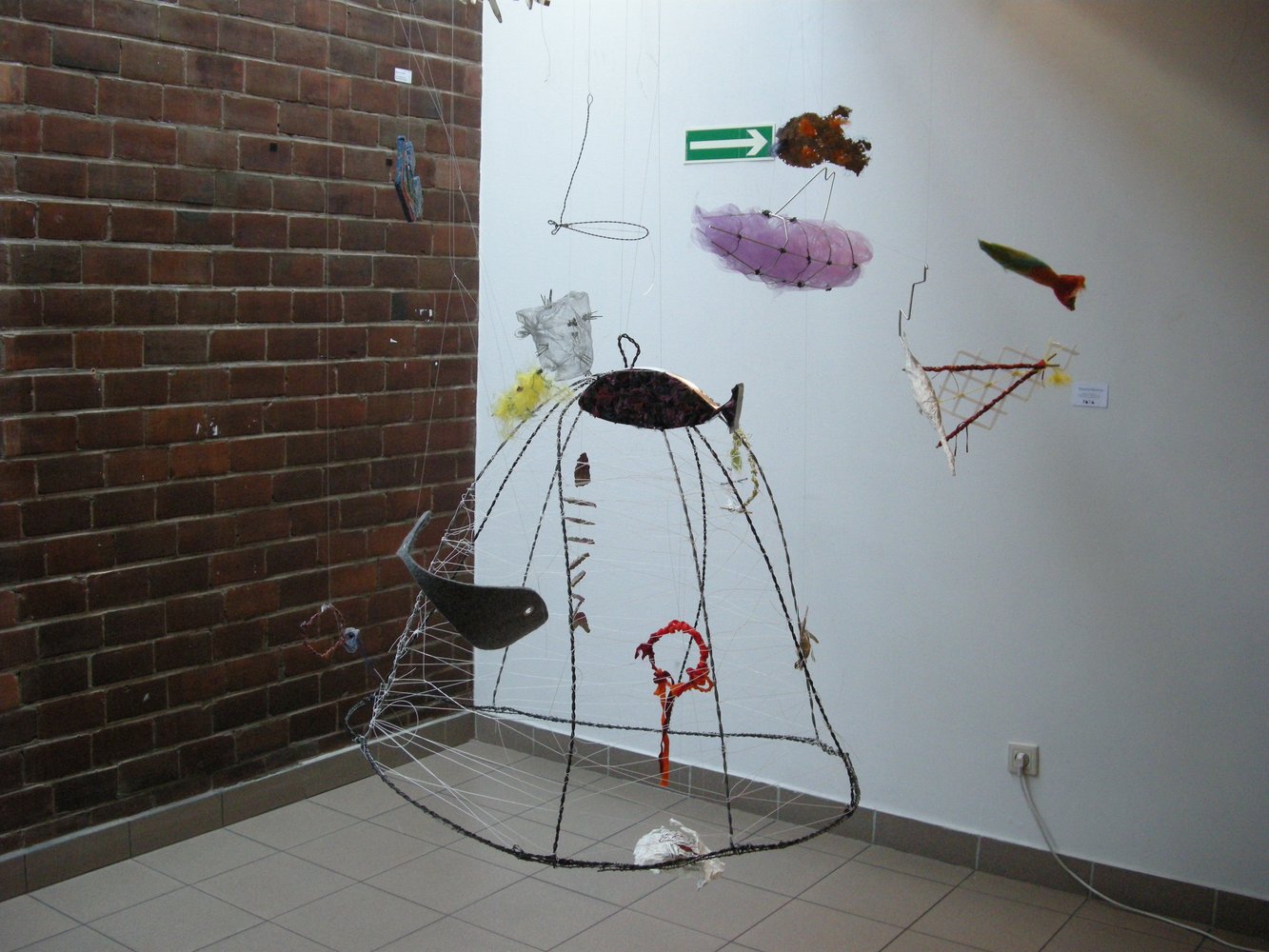 papieru czerpanego i drutu: u góry pływają kolorowe ryby, poniżej