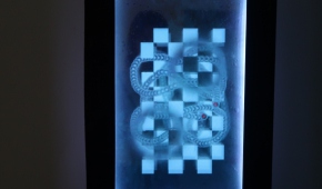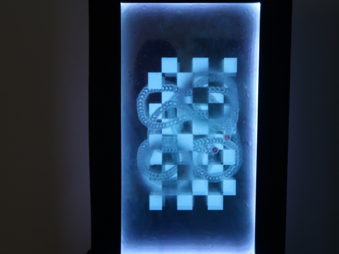 I jeszcze jedna niezwykle intrygująca praca z dziedziny nowych mediów – tajemniczy obiekt Wiktorii Głowackiej „888”, czyli prostopadłościan, w którego wnętrzu odbywa się coś nieoczywistego i trudnego do opisania. Oto transparentna, granatowa głębia, jakby „ułożona” pionowymi warstwami woda w stojącym w pionie akwarium, do tego szachownica 3D, a na tym tle wyświetlana jest projekcja z pełznącym zakolami wężykiem, trochę jak w starej grze komputerowej. Wizualizacja nieskończoności.
