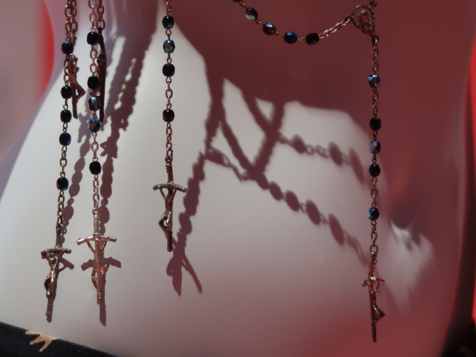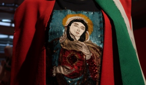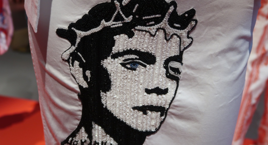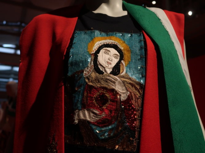Niezależnie od tego, czy ta estetyka trafia w czyjś gust, czy nie, to nie ona jest tu najważniejsza, lecz przekaz. Arkadius bowiem poprzez swoją twórczość komentował aktualną rzeczywistość, sytuację na świecie, nie stroniąc od kontrowersji – wręcz prowokacyjnie po nią sięgając dla wzmocnienia wymowy prac. Seksbiznes, natura, mitologia i polityka międzynarodowa, Matka Boska, queer, wysoka kultura i ludowość (w tym łowickie koguciki)... I tu objawia się kolejna warstwa tej wystawy, a zarazem dowód na to, że moda to sztuka – tak zwani prawdziwi artyści tworzą dzieła uniwersalne, które ciągle się aktualizują, a niekiedy najbardziej aktualne wydają się po latach od powstania. Tak właśnie odbiera się dziś projekty Arkadiusa. Choćby kolekcję, w której gwiazdę Dawida i biało-czerwone pasy z amerykańskiej flagi twórca łączy z motywem chusty arafatki. Albo tę, w której kobiecość powiązana została z wizerunkiem Madonny z Dzieciątkiem (i innymi elementami kultu religijnego: różańcami, fragmentami stuły kapłańskiej) oraz nadrukami fotografii niemowlęcia – gdyby kolekcja powstała na polski rynek, można by uznać, że to wizualizacja stereotypu Matki Polki, pozostającego w opozycji do idei kobiecej wolności.