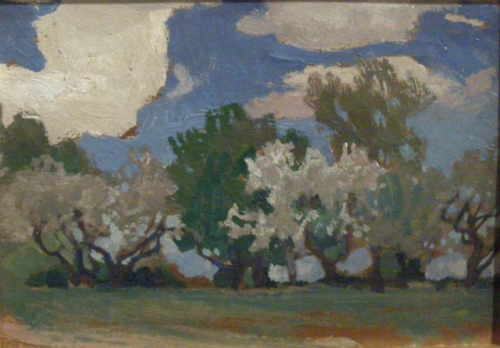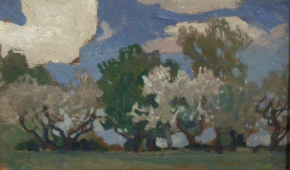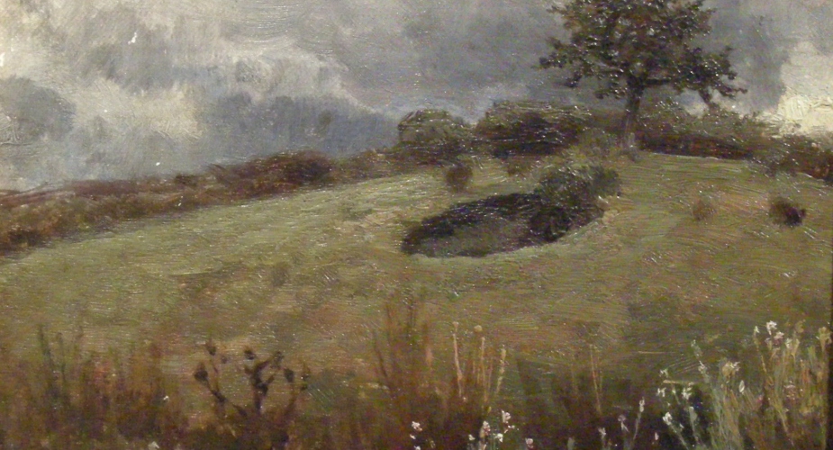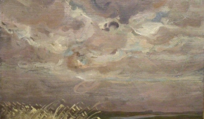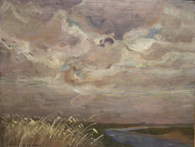 Mnie najbardziej zachwyciły dwa obrazy z wystawy. Pierwszy o przepięknym świetle, delikatny, jest jeszcze realistyczny, malowany z detalami – przedstawia pagórek z łąką, na nim drzewo, na pierwszym planie polne kwiaty. Drugi przeciwnie – bardzo uproszczony, ograniczony jest do zajmującego trzy czwarte powierzchni płótna widoku dynamicznych szaro-brązowo-fioletowych chmur oraz fragmentu rzeki i suchych trzcin.