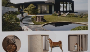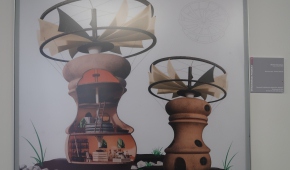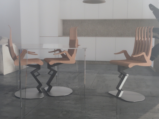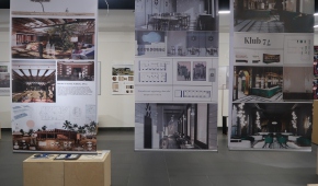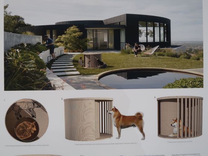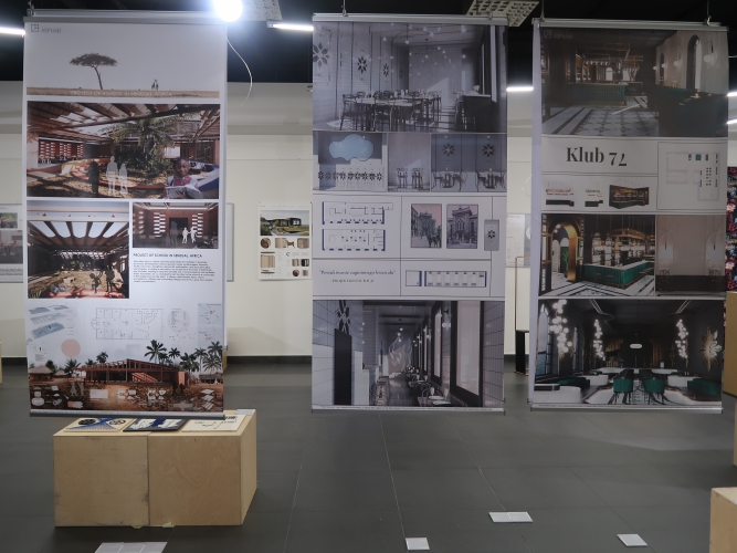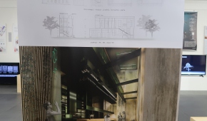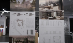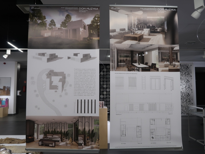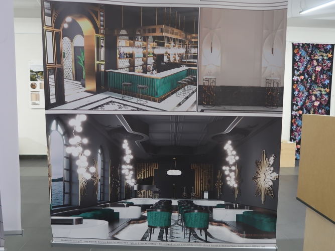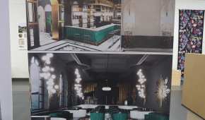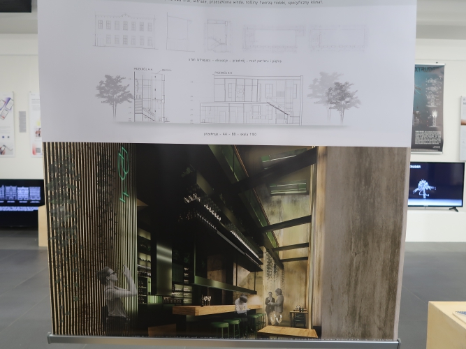 Spośród pomysłów na architekturę wnętrz najbardziej urzekający wydał mi się pomysł Marii Pniewskiej na wygląd restauracji, inspirowany łódzkimi kamienicami i witrażami (inspiracje łódzką zabudową są obecne również w kilku innych projektach prezentowanych na wystawie) – industrialna, nowoczesna, a zarazem kameralna i przytulna przestrzeń skonstruowana z drewna, stali i zielonego szkła, której rytm nadają pionowe i poziome podziały.