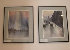 subtelne akwarelki z widokami miast - sylwetkami budynków i ludzi;