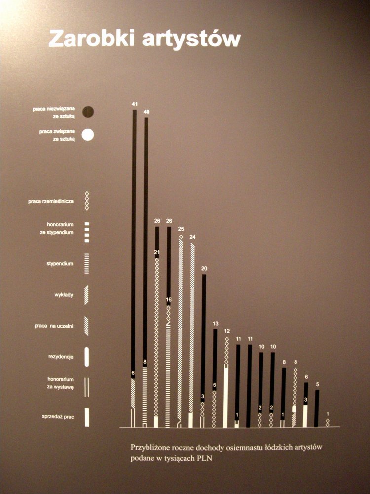 Główną osią pokazu wcale nie są artystyczne działania, choć owszem, możemy obejrzeć nagrania performance’ów, filmy, zdjęcia z wystaw i wystąpień, a nawet parę dzieł. Tę oś zarysowuje właśnie problematyka ekonomiczna, i to w szerszym zakresie, bo dotyczącym nie tylko galerii, ale w ogóle twórców. W 2011 r. artysta Marcin Polak (jeden z zaprzyjaźnionych ze Wschodnią twórców, którzy przygotowali coś od siebie na jubileuszową wystawę) zaprezentował we Wschodniej projekt poświęcony ich sytuacji materialnej – a konkretnie temu, jak zarabiają na życie. Okazało się, że wszystkim, tylko nie twórczością. Częścią rozłożonego na lata projektu było sformułowanie postulatów, w jaki sposób można by pomóc twórcom, i przedstawienie ich władzom miasta. Postulaty ludzi kultury znalazły się na wystawie. Te działania Polaka mają konkretne efekty: choćby miejski system stypendialny dla artystów. Ale czy to faktycznie poprawiło ich sytuację? Nadal tworzenie to hobby – twierdzi Marcin Polak.