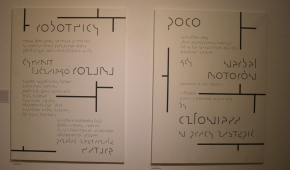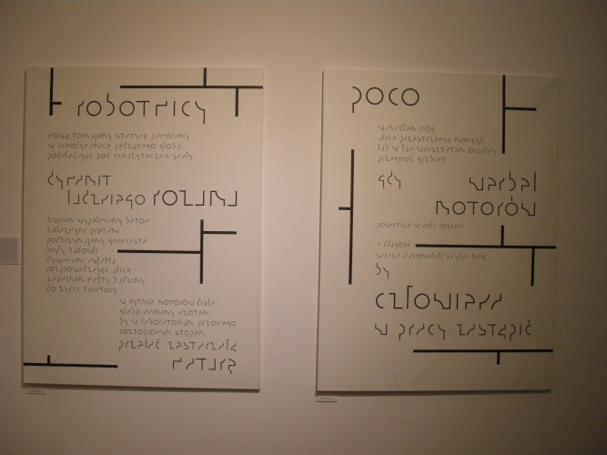 Z kolei Sławomir Iwański, autor typograficznych plakatów, pokazuje to, co musiało mieć na niego wpływ – alfabet Władysława Strzemińskiego. Na białym tle czarnymi literami zapisał nim jego wiersze, uzupełniając całość czarnymi liniami wziętymi z neoplastycyzmu. Tekst działa najpierw jako abstrakcyjny obraz, dopiero po chwili zaczynamy rozczytywać pojedyncze słowa układające się w wyrażenia świadczące o tym, że to tekst powstały w erze nowoczesności, jak: „żelazne pręty”, „dynamit ludzkiego rozumu”, „zapach nafty”, „w rytmie motorów”, „by człowieka w pracy zastąpić”.