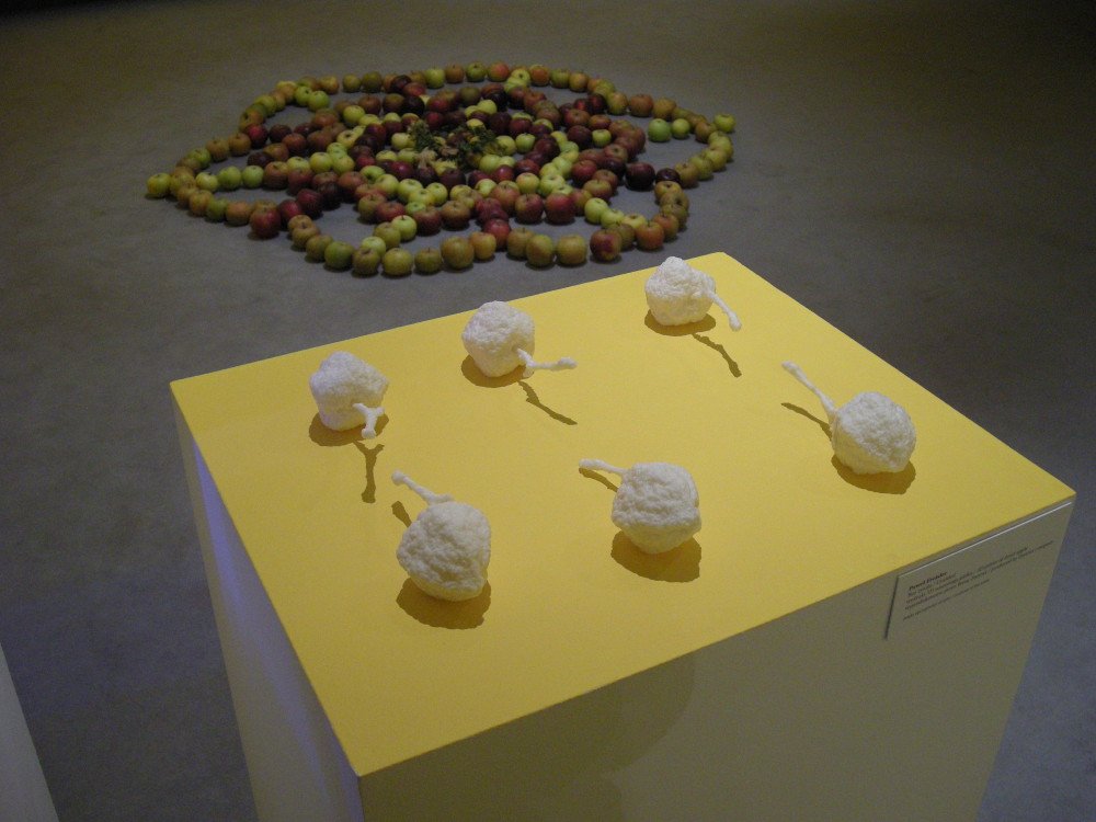 Poza tym można oglądać ułożoną na podłodze mandalę z jabłek, jedno z zasuszonych jabłek z kolekcji Freisera (znalazło się w gablotce, jak biżuteryjny obiekt), wydrukowane przy pomocy drukarki 3D modele tego jabłka, jego fotografię autorstwa Piotra Życieńskiego. Aha – i butelki z sokiem jabłkowym jako przykład twórczości Jimmiego Durhama. A jeszcze tablicę korkową z przypiętymi karteczkami z haiku tworzonymi przez gości wystawy.