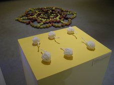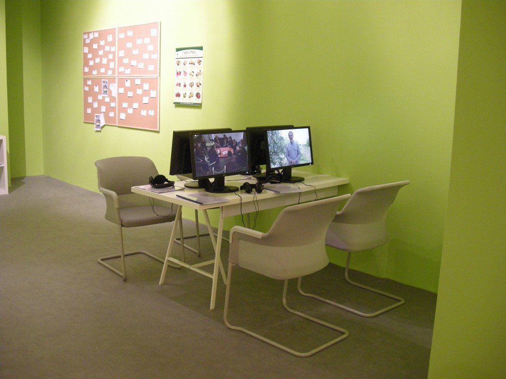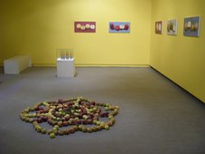 „dzieła” trafiają na wystawę w Muzeum Sztuki?!Już podczas lektury zapowiedzi wystawy „Jabłko. Introdukcja. (Ciągle i ciągle od nowa)” oczy coraz szerzej otwierały mi się ze zdumienia, ale jeszcze bardziej zdumiała mnie sama ekspozycja prac Antje Majewski i jej gości. Otóż działalność tej berlińskiej artystki dotyczy m.in. relacji ludzi z naturą, ekologiczny wydźwięk ma też twórczość osób zaproszonych do jej „jabłkowego” projektu. I może nawet to jest ciekawe, a niewykluczone, że też potrzebne, ale zaprezentowane w takiej formie jak na wystawie w ms1 wydaje się raczej groteskowe. Może przez dosłowność – nie dostrzegam żadnej metafory, ironii, która podobno zawarta jest w niektórych pracach. Są tu głównie filmowe zapisy rozmów z różnymi ludźmi na temat roślin hodowlanych, w szczególności jabłoni. Problem w tym, że nie dowiadujemy się z nich nic nowego: tak, wiedziałam, że jabłonie się opryskuje, że zwierzęta i ptaki przenoszą nasiona, że teraz są inne odmiany niż dawniej… Filmy nie są na tyle interesujące, by udało mi się dotrwać do końca któregoś z nich.