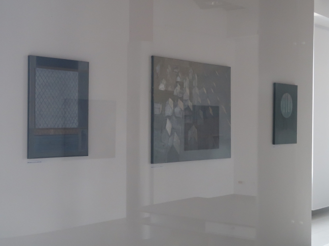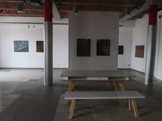 Obrazy Mileny Romanowskiej zdają się intrygujące i chętnie bym się im przyjrzała, jednak wystawa „Grodzenie przestrzeni” w Galerii Patio2 nie jest dostępna. Drzwi galerii mieszczącej się w budynku Akademii Humanistyczno-Ekonomicznej pozostają zamknięte (taka jest chyba codzienność, bo to nie pierwsza wystawa, na którą się nie dostałam) i nie ma na nich żadnej informacji o możliwości wejścia do środka. Co najwyżej można z daleka zerknąć na wystawę przez szklane ściany – czego doświadczyłam. O obrazach piszę więc na podstawie… katalogu do tej ekspozycji. Dziwne to i niekomfortowe, gdy nie można przypatrzeć się malarskiej materii, fakturze farby i płótna, pociągnięciom pędzla, przenikającym się warstwom koloru. W tym przypadku – głównie odcieniom błękitu i brązu.