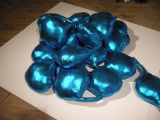 Dominika Zientek zaprojektowała subtelne przedmioty z filcu i niemalowanej sklejki: podkładki pod kubki i talerze, nakładki na stołek oraz lampę. Izabela Krześlak konsekwentnie szyje trójwymiarowe przedmioty z metalizowanych tkanin – tym razem jest to specyficzna niebieska pufa.