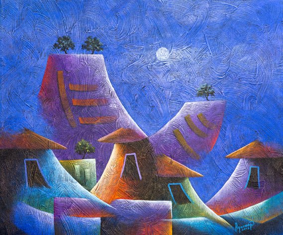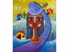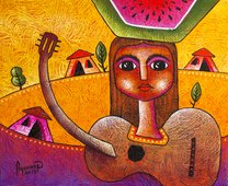 Po ptakach kolejny dominujący symbol w pracach Pereza to arbuz – czerwony i soczysty, dominujący nad innymi elementami obrazu, które przypominają zarys zacienionego, nieprzyjaznego miasta. Wieś widziana oczami Pereza jest bajkowa, wielobarwna, sielska. Domki jak dla krasnoludków zdają się kołysać we wszystkie strony w rytm wiatru. Kolejny motyw to kobiety – zapewne wieśniaczki. I one, jak ptaki, zlewają się w jedno z otoczeniem, z przedmiotami (gitara to tułów, jej gryf to ręka, ptak to zarazem dłoń i nakrycie głowy). To malarstwo jest hołdem złożonym naturze i spokojnemu życiu w zgodzie z nią. Intrygujące...