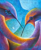To obrazy przedstawiające, ale nie dosłowne. Ich świat jest baśniowy, wypełniają go metafory, symbole zrozumiałe pewnie tylko dla osób dobrze znających kulturę Ameryki Środkowej czy Południowej. Ptaki (czy to kolibry?) z towarzyszącymi im symbolami słońca czy księżyca kojarzą mi się z aztecką mitologią. Podobnie – z aztecką ornamentyką – kojarzą mi się elementy „wieży” zwieńczonej kołem i półksiężycem.