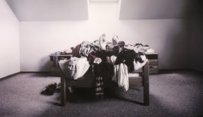 łóżkami zawalonymi ciuchami. Bałagan, jakby ktoś w poszukiwaniu