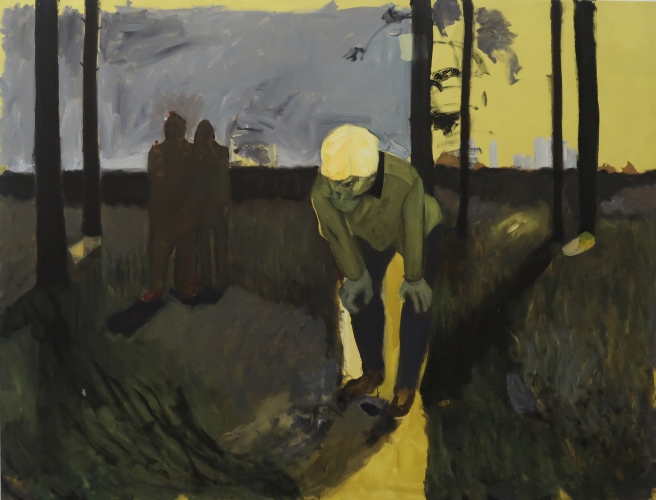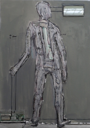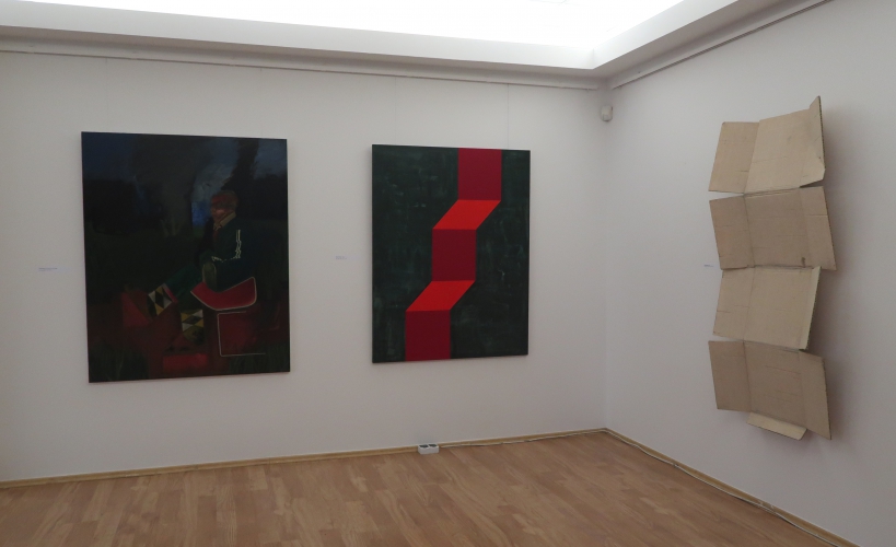 Tomasz Matuszak jeszcze bardziej niż pozostali przekracza ramy tradycyjnego malarstwa. Tworzy m.in. przypominające obrazy obiekty (we „Fracking Good” z 2015 r. z malarstwa pozostało np. tylko użycie pigmentu) wskazujące na dewastację naturalnego środowiska przez przemysł. Obrazuje ją zniszczenie przedstawienia – naniesione na drewno wizerunki wzgórz czy landszafty wyglądają jak nadpalone. Makabryczna praca „Wszystkie moje marzenia” z 2018 r. to tatuaże na skórze o kształcie ludzkiego tułowia i rąk (bez dłoni). Niesamowity jest „Trash” – kojarzący się z twórczością Marii Stangret drewniany obiekt udający rozłożone niemal na płasko kartonowe pudło. Powieszony na ścianie obok czerwonej „połamanej” „Wstęgi” Ryszarda Hungera, sugeruje artystyczny dialog tak samo jak w przypadku obrazów Hungera przeplatanych z obiektami Kosiec. Ale tu dochodzi jeszcze trzeci element – płótno Piotra Kotlickiego „Krytyk sztuki na swoim tarasie” z 2019 roku, malarstwo przedstawiające, a mimo to świetnie wpasowujące się w abstrakcyjne sąsiedztwo. Kompozycja przypomina układy linii i kształtów z „Wstęgi” Hungera (2020), która, jak już zostało wspomniane, koresponduje z kolei z załamaniami w „Trash” Matuszaka.