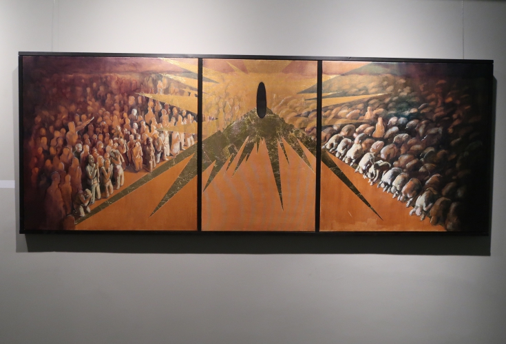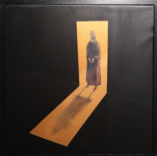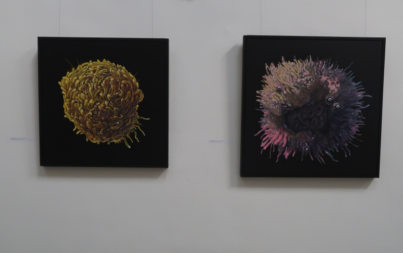 Z okazji 55-lecia twórczości profesora Ryszarda Hungera zaproszono do wspólnej z nim ekspozycji malarzy, którzy byli jego uczniami w Akademii Sztuk Pięknych w Łodzi: Małgorzatę Kosiec, Piotra Kotlickiego, Tomasza Matuszaka, Tomasza Musiała, Bartka Otockiego, Rafała Sobiczewskiego i Jana Jubaala Wasińskiego. To ciekawe, że spod jednej ręki wyszły tak różne osobowości artystyczne. Ich twórcza autonomia i indywidualizm świadczą o pedagogu jak najlepiej. Nijak nie da się przyrównać obrazów jednych twórców prezentowanych na wystawie do innych.Jan Jubaal Wasiński od lat seryjnie „wytwarza” wiruso-demony – kolorowe stwory z doklejonymi plastikowymi oczami. To znaki ogólnoludzkiego strachu przed drobnoustrojami, który ostatnio tak boleśnie się zmaterializował. Dziś można odczytywać te wcześniejsze obrazy (a Wasiński obecnie kontynuuje tę serię) jako zapowiedź przeczuwanej przez artystę pandemii – twórcy przecież miewają intuicję… Bardzo ciekawy jest też jego dyptyk z 2021 roku, stworzony przy użyciu złotej farby (czy też złotej folii). „Obecność” to malutki obraz przedstawiający sylwetkę księdza wkraczającego do ciemnego pomieszczenia ze sfery światłości. Większa „Nieobecność” to czysty blask emanujący z wielkiego, umieszczonego centralnie oka, padający na tłumy klęczących (z lewej strony płótna) i bijących pokłony (z prawej) ludzi. To prawdziwa moc, coś, czego potrzebujemy i poszukujemy. A obrazek obok jest tym, co mamy realnie: karykaturą duchowości i metafizyki. Dyptyk można też interpretować inaczej – Wasiński nigdy nie dopowiada, nie narzuca sposobu odczytywania. Jego obrazy są wieloznaczne.