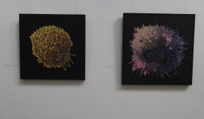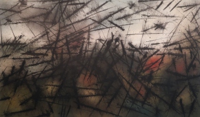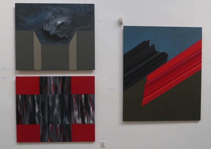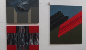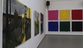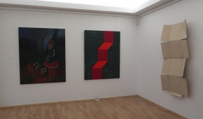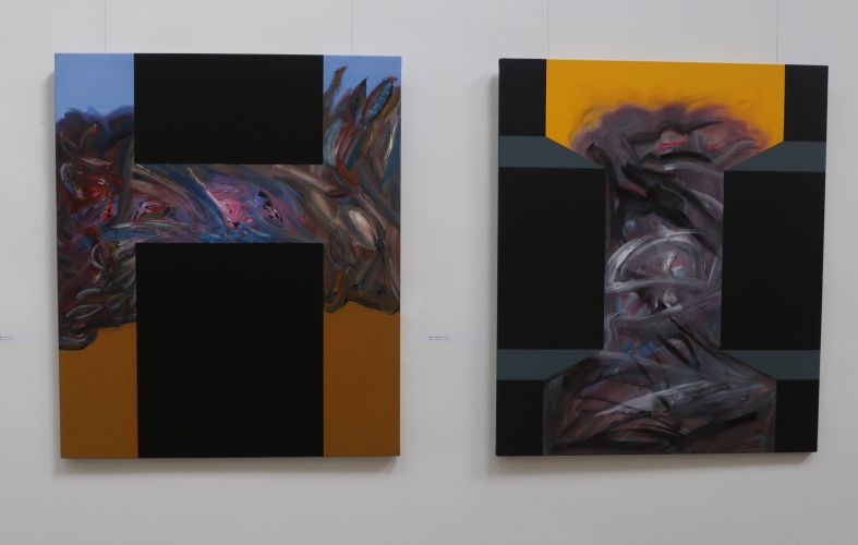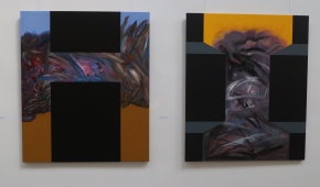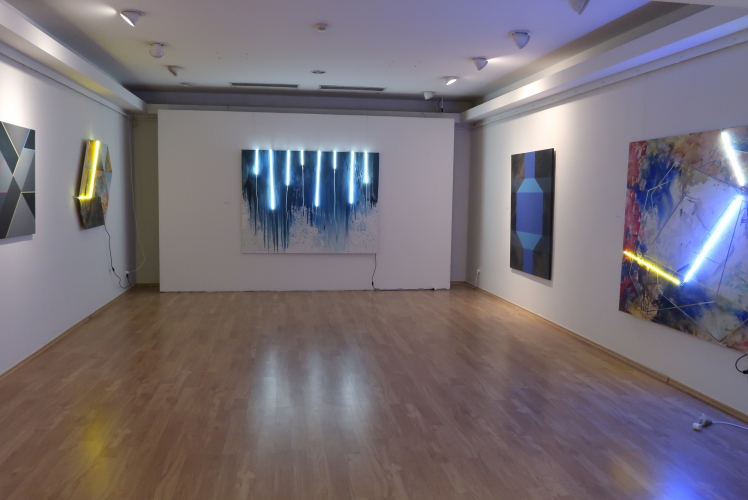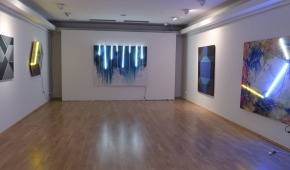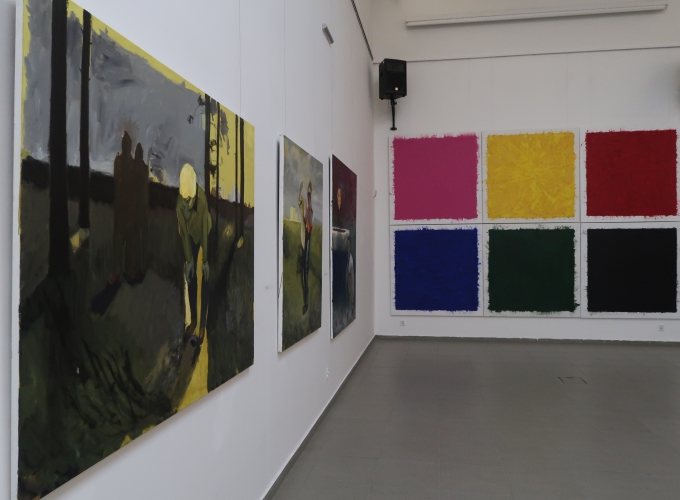 Małgorzata Kosiec w części abstrakcyjnych obrazów także wykracza poza płaskość płótna i poza malarską materię, sięgając po elementy z innego niż malarski porządku. Figury powołane przy użyciu farby uzupełnia neonami, które układa w linie powielające fragment figury albo dopełniające smugi farby. Ten cykl dobrze koresponduje z umieszczonymi obok geometrycznymi obrazami Ryszarda Hungera. Prace obojga twórców dialogują tu ze sobą i wzbogacają się wzajemnie.