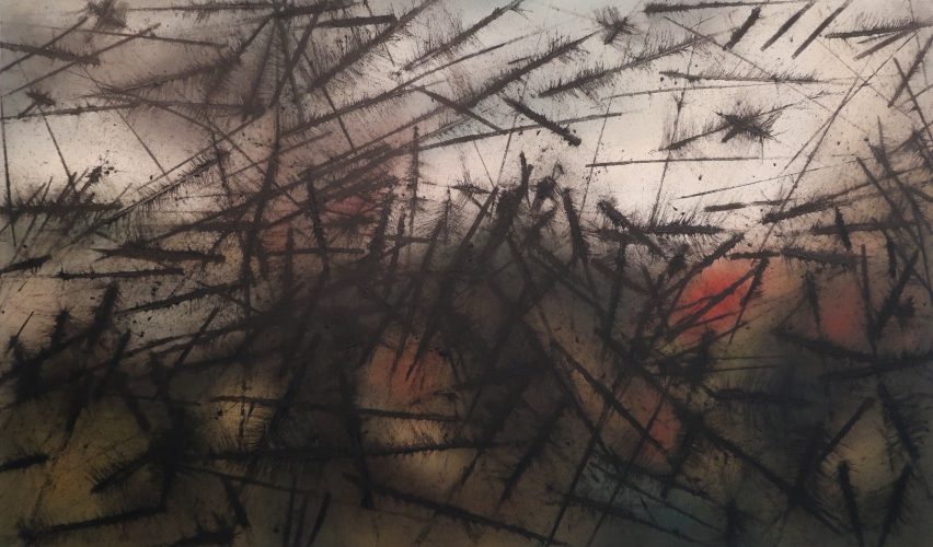 Sam Ryszard Hunger na swoich abstrakcyjnych płótnach zderza porządek z chaosem. Ten pierwszy reprezentują gładko i równo malowane figury geometryczne, chaos to nierówno pokryte farbą tła albo swobodne „mazy”. Artysta przekracza też płaską powierzchnię obrazu – ale używa do tego wyłącznie malarskich środków – układając kształty w taki sposób, że wydają się trójwymiarowe.