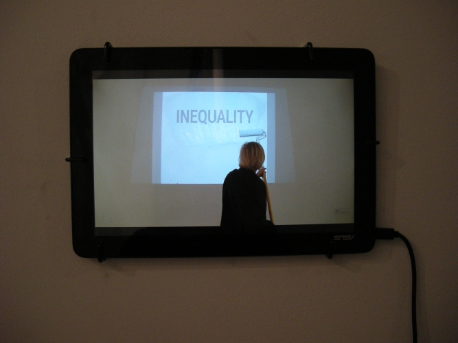 Dobrym przykładem tego, jak w metaforyczny, nie dosłowny sposób można mówić o skomplikowanych i trudnych sprawach, jest wideo Moniki Czarskiej, na którym artystka próbuje zamalować czystą białą farbą słowo „inequality” (nierówność), ale się nie da – napis jest wyświetlany na ścianie.