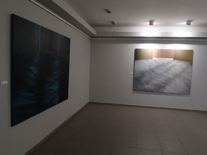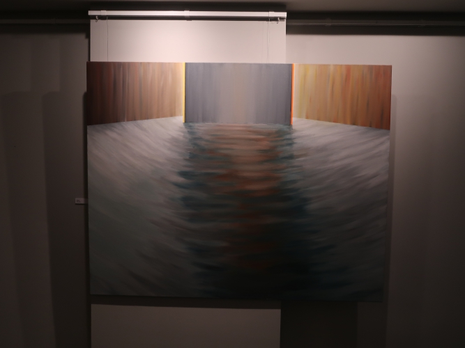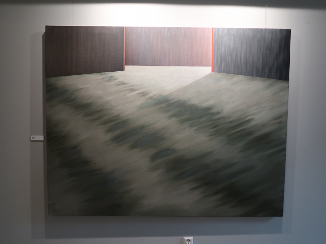 Bogdana Skopińskiego zajmuje zagadnienie przestrzeni i jej postrzegania (można oglądać m.in. dwa trzyczęściowe „Obrazy kątowe” z przesuniętym szarym pasmem, które z bliska są płaskimi abstrakcjami, a z daleka nabierają trójwymiarowości i realizmu – zdaje się, że to wstęga spływa ze schodów). Artystę fascynują też zmiany otoczenia pod wpływem światła (w serii obrazów: „Wschód”, „Zachód”, „Północ”, „Południe” widzimy ten sam fragment pomieszczenia, który zmienia się w zależności od kierunku padania promieni słonecznych).