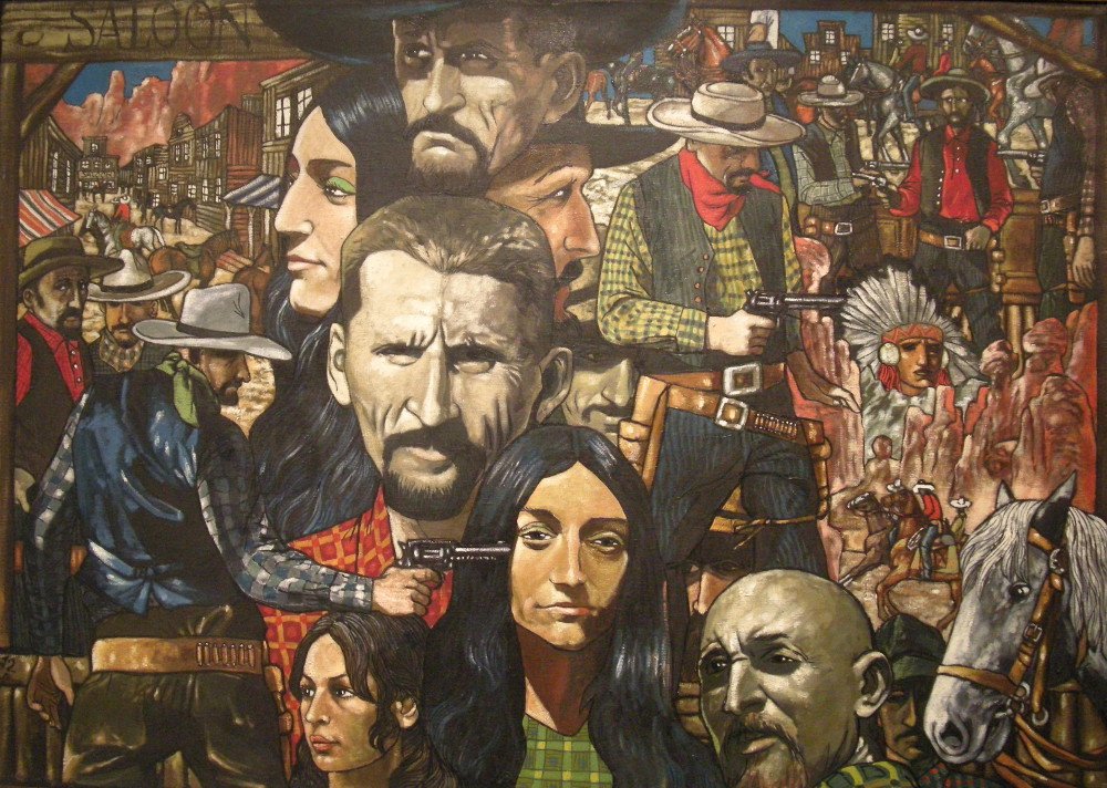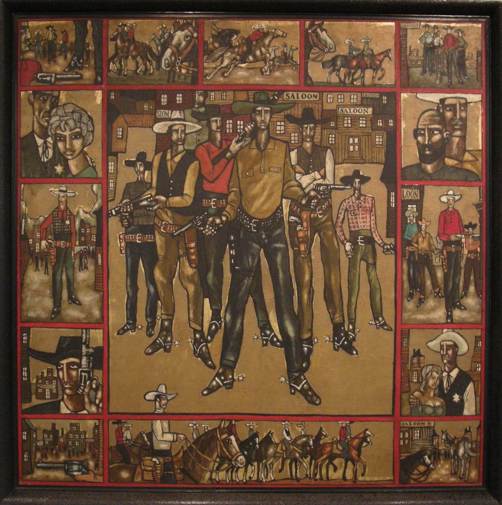 Ale Benon Liberski sięgał też po inspiracje z całkiem innej półki – nawiązywał do ikon. Na wystawie znalazło się kilka obrazów, dzięki którym można się o tym przekonać: figury, budynki umieszczone są na złotym tle, a „Western X” z 1964 r. naśladuje układ stosowany często w ikonach: główny obraz w centrum kompozycji jest otoczony mniejszymi (a gdzieniegdzie również przeciera się złote tło). Tylko postaci nie są święte: sportsmenka-Indianka, kowboje z rewolwerami i konie, albo naga kobieta siedząca na ulicy, jak Alicja w krainie czarów zbyt duża względem otaczających ją kamienic. Tyle że właśnie to złote tło ich wszystkich uświęca, nobilituje, nadaje im rangi. Aż taki zachwyt artysty, czy może jednak podśmiewanie się z popkulturowych wartości?... Jest w tym jakaś podwójność, ambiwalencja. Co ciekawe, ikona był inspiracją również dla Wiesława Garbolińskiego – we wczesnej fazie twórczości (jak wspomniałam, na wystawie nie ma jej przykładów).