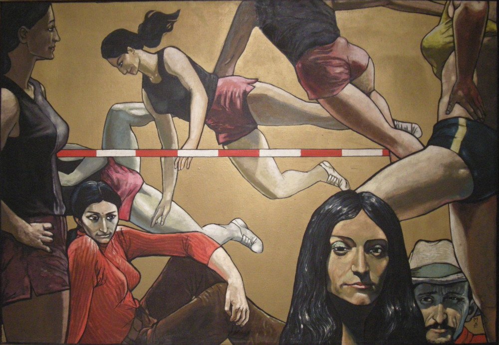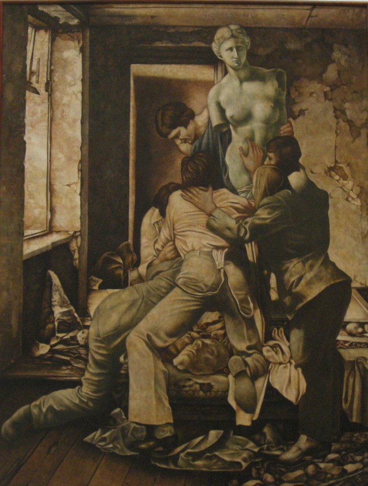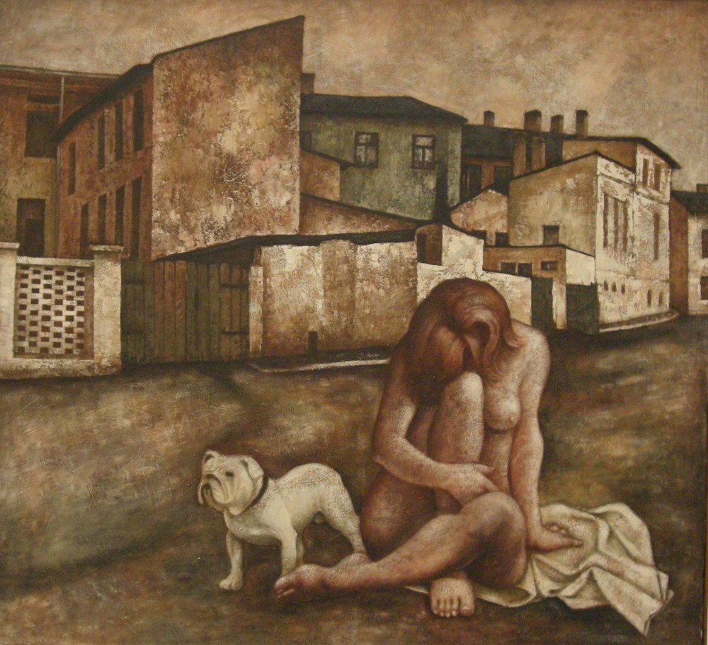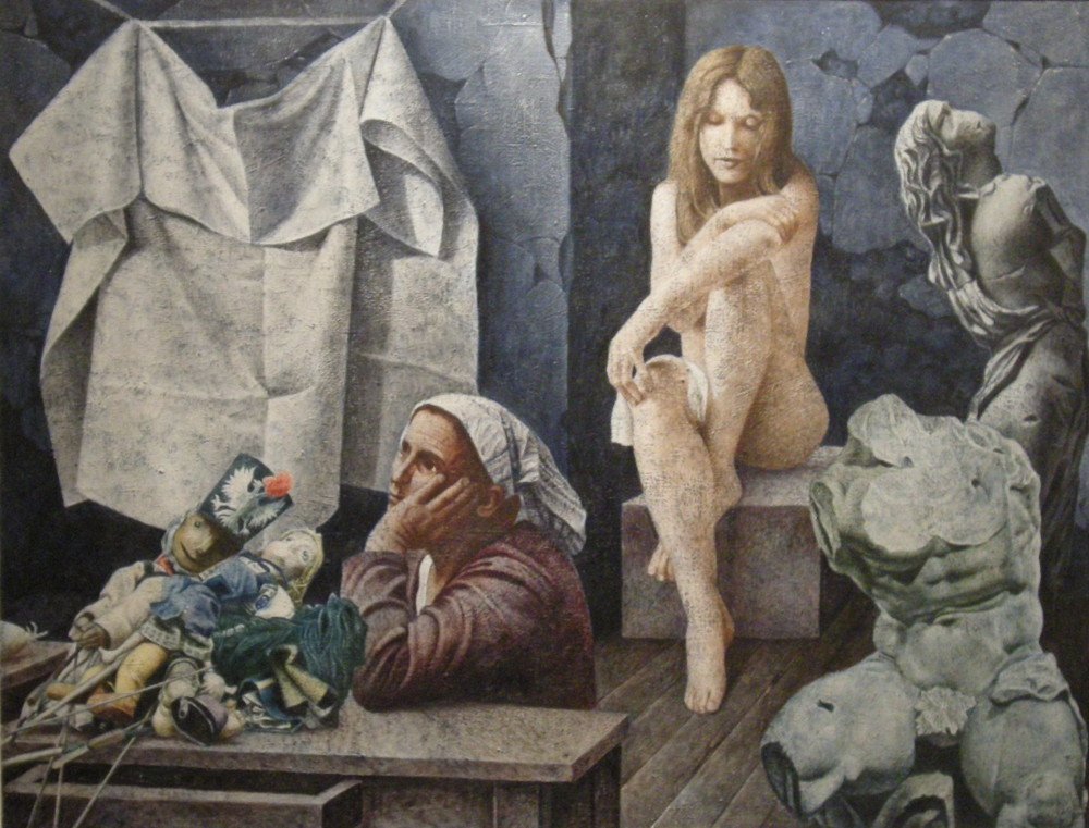 Najwcześniejsza na wystawie praca Wiesława Garbolińskiego to „Martwa natura z blaszankami” z 1970 r. Z tego samego okresu (1971 r.) pochodzi obraz „Trochę z Hedy” – jak w tytule wskazuje inspiracja (Holender Willem Claesz Heda to autor wspaniałych martwych natur malowanych w XVII wieku), motyw jest ten sam. W obu przypadkach: blaszane naczynia, ciasny kadr jakiegoś wnętrza, zniszczona drewniana ściana w tle. Obrazy ciekawe m.in. pod względem kompozycji (to cecha malarstwa obu artystów), mają też interesującą fakturę – artysta kładzie farbę przy pomocy szpachelki (?) i przeciera ją. W efekcie powierzchnia płótna wygląda jak otynkowany mur. A to nadaje obrazom surowości, podobnie jak zgaszona kolorystyka. Jakby artysta chciał, by jego twórczość wtapiała się w miasto. Bo też i miasto jest tłem dla bohaterów późniejszych prac. Ale nie miasto konkretne, tylko umowne, na pewno nie duże – to ciasno obok siebie ustawione niewielkie surowe i proste budynki (taki element geometrii w przedstawiającym obrazie). Bohaterowie są równie niekonkretni – nagie, skulone kobiety, zadumany mężczyzna w czerwonym trykocie, kukły, no i to, co bardzo typowe dla sztuki Wiesława Garbolińskiego: antyczne posągi lub ich fragmenty. Pomieszanie światów, równoległych rzeczywistości, jedna wielka metafora – jak w śnie człowieka, który sporo widział i jeszcze więcej chciałby zrozumieć.