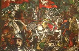 Ale i nawiązania do wydarzeń historycznych zdarzały się Liberskiemu. Oto np. obraz kojarzący się z „Bitwą pod Grunwaldem” Jana Matejki, czyli „Bitwa pod Warną” z 1976 r. z młodym Warneńczykiem na koniu. Zgiełk bitwy, piki, turbany, zbroje, końskie zady. Ani centymetra wolnej przestrzeni (to zresztą charakterystyczne dla dużej części obrazów Liberskiego). A na pierwszym planie zadumany rycerz, zmartwiony – trochę jak Matejkowski błazen.
