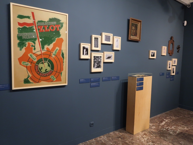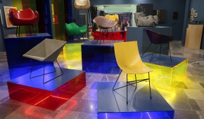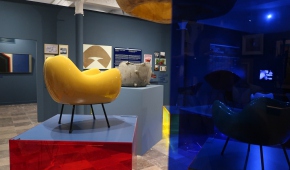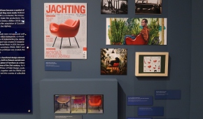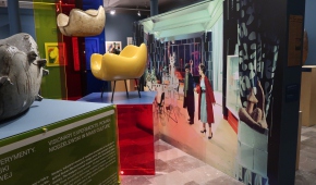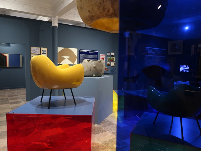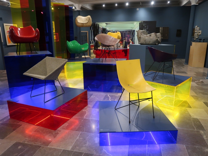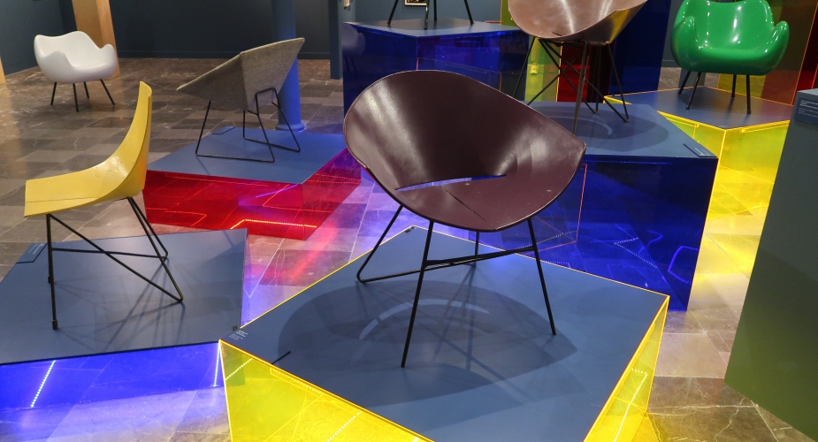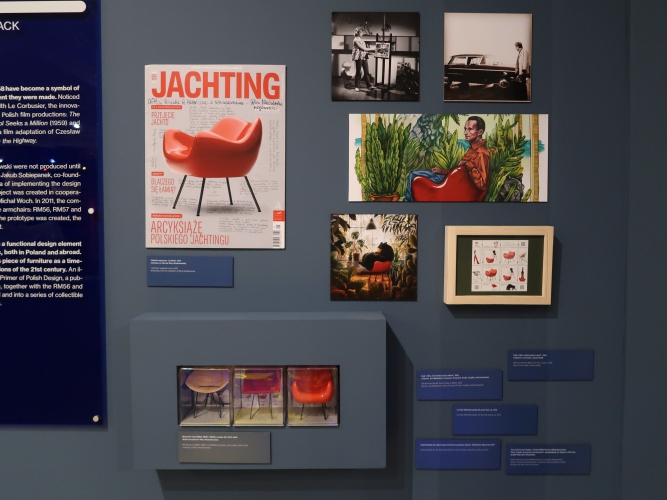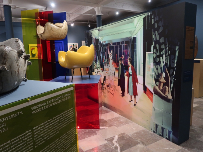 Jeszcze zanim widz będzie miał szansę docenić same obiekty, już od wejścia zostanie oszołomiony efektowną aranżacją wystawy autorstwa Mai Pawlikowskiej. W nawiązaniu do tworzyw sztucznych, których szerokie możliwości zastosowania: w meblarstwie, żeglarstwie, jubilerstwie, a nawet w sztuce wysokiej dostrzegł Roman Modzelewski, główną salę wystawy urozmaicono przezroczystymi, kolorowymi elementami z płyt pleksi: ściankami oraz dodatkowo podświetlanymi kubikami, na których stoją prezentowane krzesła i fotele. Na pleksi (nieprzezroczystym) nadrukowano też teksty towarzyszące poszczególnym częściom ekspozycji. Ściany galerii pokrywa z kolei inspirowany zainteresowaniami twórcy morski kolor. Zanurzamy się zatem w gamie barwnej i świetle, by po chwili wydobyć z nich poszczególne przedmioty, archiwalne fotografie (w tym Modzelewskiego z jego asystentem – młodym Stanisławem Fijałkowskim – z lat 50.) czy projekty. Jest też gratka – szkicownik z lat 30.–40., ściśle wypełniony rysunkami przedmiotów. A tłem dla foteli i krzeseł staje się powiększony kadr z „Ósmego dnia tygodnia” Aleksandra Forda (1958), w którym dumnie prezentuje się RM58. Zapewne był to jego popkulturowy debiut…