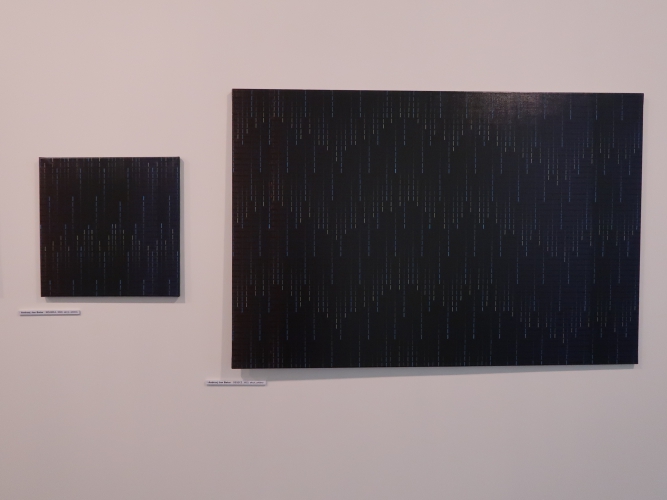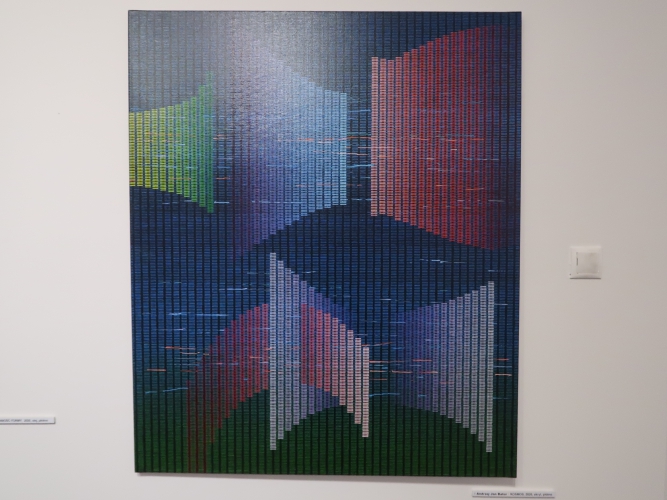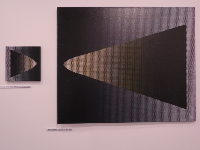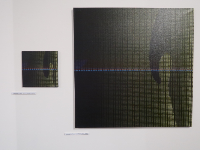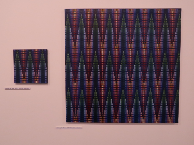 Andrzej Jan Bator od lat konsekwentnie podąża jedną drogą – budując przedstawienia z linii (lub równych odcinków) i kolorów. Niektóre jego obrazy są całkowicie abstrakcyjne, inne pozwalają na skojarzenia z konkretnymi kształtami znanymi z rzeczywistości. Na wystawie w Imaginarium znalazły się te pierwsze. Ciekawe, że artysta często maluje dwie wersje obrazu – mniejszą i większą (na wystawie zestawiono je ze sobą), jakby wypróbowywał oddziaływanie linii i kolorów w różnych formatach. Niekiedy pozwala sobie przy tym na żart, np. dużemu obrazowi nadając tytuł „Deszcz”, a małemu, będącemu wycinkiem większego – „Mżawka”.
