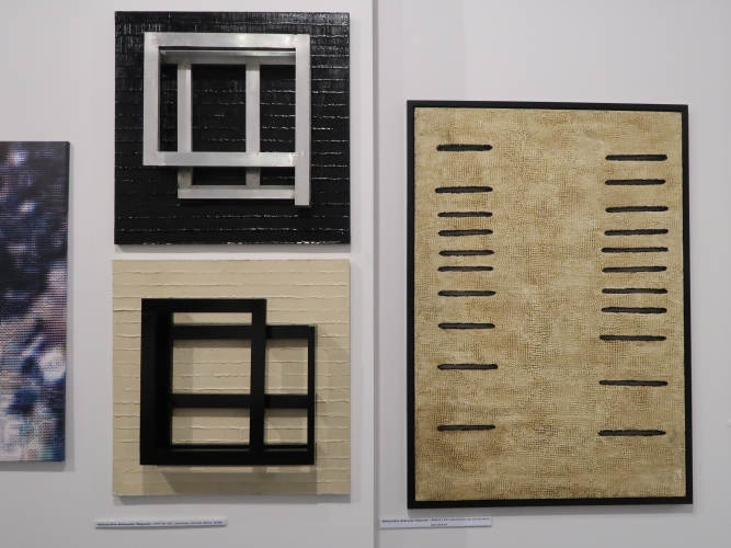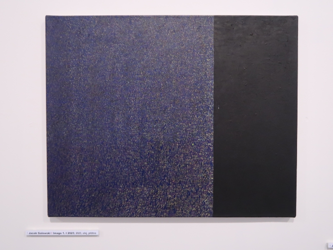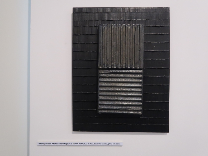 Czterej artyści tworzący grupę od 2017 roku (absolwenci obecnej Akademii Sztuk Pięknych w Łodzi): Andrzej Jan Bator, Robert Jundo, Jacek Galewski i Maksymilian Kreutz-Majewski to artystyczne indywidualności, ale, choć prace każdego z nich zdecydowanie różnią się od prac pozostałych twórców, wszystkie je łączą wspomniane odwołania do twórczości Strzemińskiego. To świadczy o zróżnicowaniu owej twórczości. Każdy może z niej wyłuskać to, co jest dla niego interesujące i rozwinąć we własną, unowocześnioną wypowiedź.Najefektowniejsze są obiekty Maksymiliana Kreutz-Majewskiego (w opisach prac występującego jako Maksymilian Aleksander Majewski) m.in. z metalu i obrazy na płótnie udające przestrzenne obiekty z blachy – one też wydają mi się najciekawsze spośród wszystkich prac prezentowanych na wystawie. Artysta zderza w nich bowiem surowość, brutalność materii z awangardowym wysublimowaniem formy. Namacalność z intelektualnym wykoncypowaniem. Rzeźbiarskość z malarskością. Kreutz-Majewski nawet swoje trójwymiarowe prace wywodzi z idei płaskiego obrazu – świadczy o tym nie tylko sytuowanie ich na ścianie, ale i ich forma, krycie powierzchni farbą w taki sposób, w jaki kryje się nią płótno. To obrazy, które wychodzą w przestrzeń i konfrontują się z nią. Bywa, że artysta sięga po ideę czarnego kwadratu Kazimierza Malewicza – nie godzi się jednak na jego pewną ostateczność (czarny kwadrat na białym tle miał być kresem malarstwa narracyjnego, uwolnieniem malarstwa od obowiązku opowiadania o świecie, czystym odczuciem bezprzedmiotowości, nową ikoną – kwadrat był dla Malewicza formą podstawową). Obiekty Kreutz-Majewskiego coś o świecie mówią, poddają się interpretacji poprzez pewne skojarzenia. Gdzieniegdzie dochodzą jeszcze inne inspiracje – twórczością reagującą czy wpływającą na przestrzeń, choćby niebieską linią taśmy blue scotch Edwarda Krasińskiego (Maksymilian Kreutz-Majewski „Blue lines”, 2021). Zapewne nie bez znaczenia w pracy z przestrzenią, w jej zagospodarowywaniu, dzieleniu, nadawaniu funkcji jest scenograficzne doświadczenie autora.