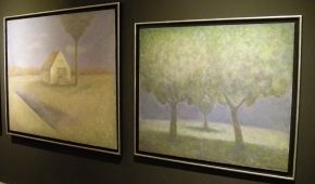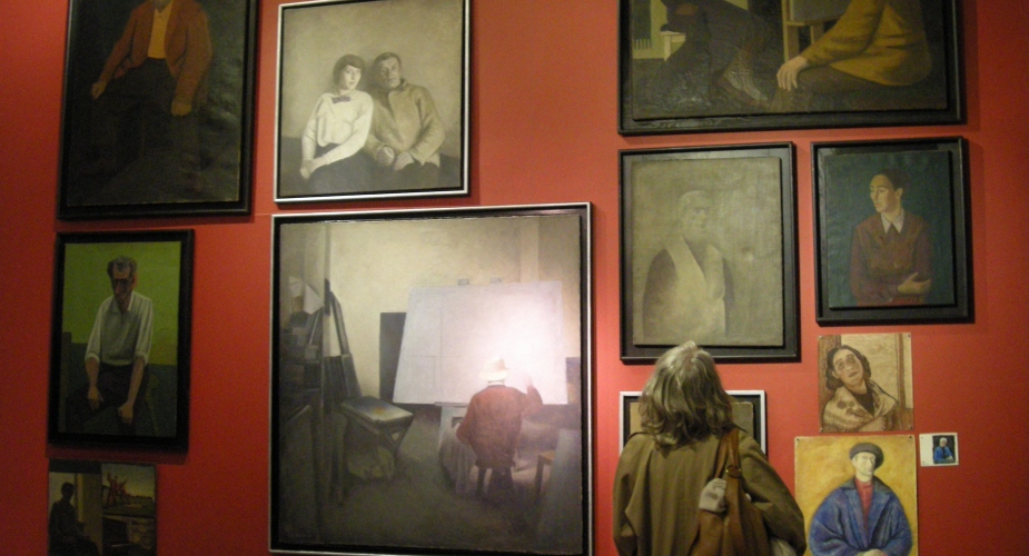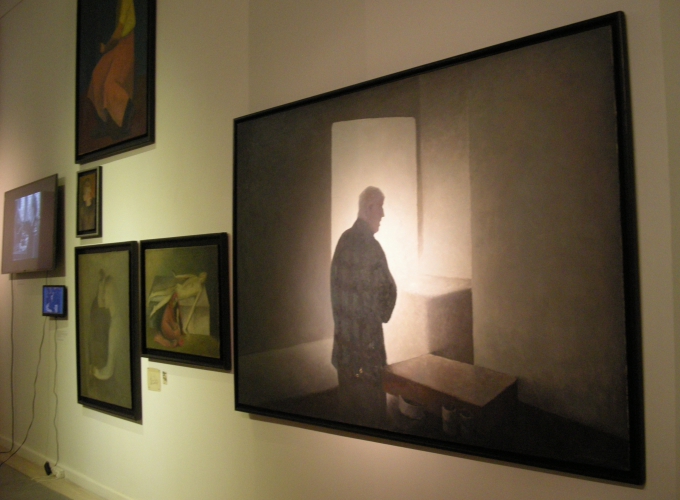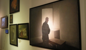 I moja ulubiona praca z tej wystawy – świetlista, jakby malowana gdzieś z zaświatów „Pracownia z portretem” z lat 1998-2000. Tutaj już artysta jest sam, siedzi tyłem do widza przed pustym płótnem – jakby zapraszając do zadumy nad tym, czym powinien być przedstawiający obraz malarski. Na ile pokazywać rzeczywistość, a na ile wewnętrzny świat autora, przez który owa rzeczywistość jest filtrowana. To też wskazanie na samotność człowieka stojącego przed takim pytaniem – i przed pustym płótnem.