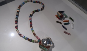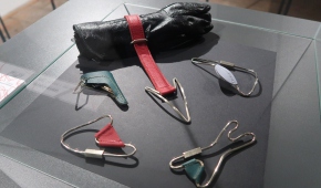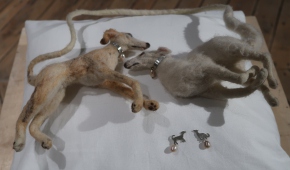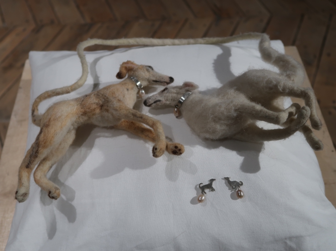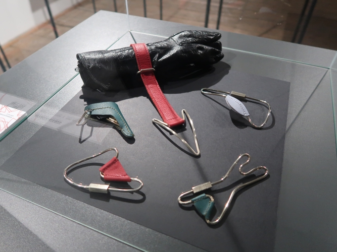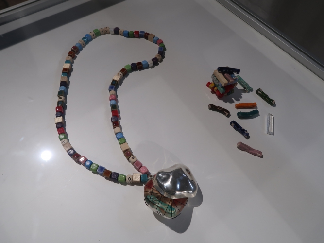 Spośród wielu na wystawie ciekawych projektów biżuterii wskażę jedną, bo nietypową. Na pięciu poduchach ułożono jej elementy z filcu, metalu i pereł, w kształcie psów. Obrazują krąg życia, zapętlenie narodzin, dojrzewania i śmierci.