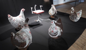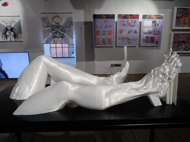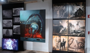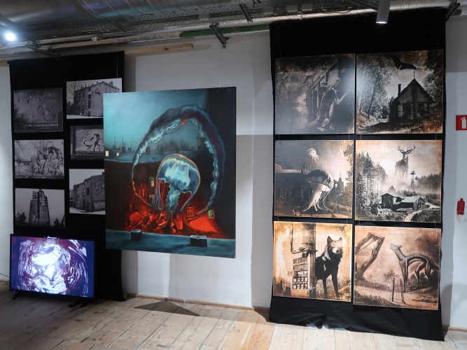 Dyplomy magisterskie i licencjackie pokazywane są na jednej wystawie, choć rozdzielone na dwa piętra Fabryki Sztuki. Nie wiem, czy ten podział jest konieczny – gdyby dyplomy wymieszać, podkreśliłoby to fakt, że prace łączy pomysłowość i artystyczna (czy też designerska) jakość, niezależnie od tego, na jakim etapie nauki jest dyplomant.Dobrze, że połączono sztuki piękne z projektowymi – ich sąsiadowanie może stwarzać interesujące konteksty. Jedne prace mogą dopowiadać inne, jak to się stało w części ekspozycji poświęconej dyplomom magisterskim. W jednej z hal powstała przestrzeń wypełniona fantasmagoryczną atmosferą jak z dystopijnego filmu o świecie zamieszkałym przez zombie, potwory i zdeformowanych ludzi. Jest to tak spójna całość, jakby wielu dyplomantów przygotowało do tego „filmu” projekty scenografii, postaci i kostiumów. Mamy do czynienia z równoległą rzeczywistością.