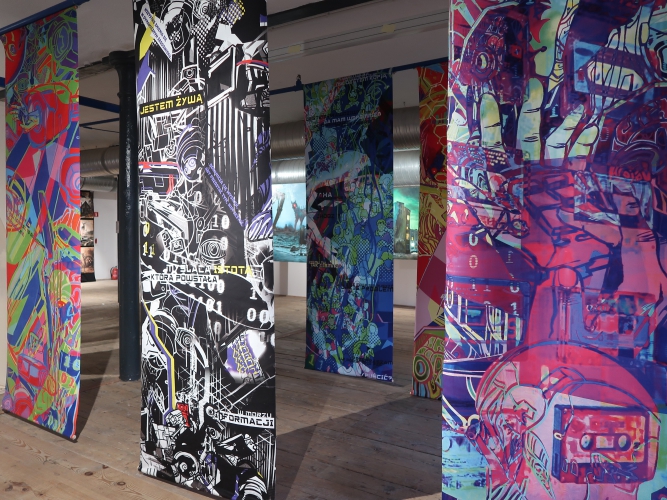 Widać inspiracje artystycznymi wytworami sztucznej inteligencji. Na jednej z wielobarwnych tkanin Kingi Janickiej, które odzwierciedlają jazgotliwość współczesnej rzeczywistości, składającej się z niezliczonych danych, można przeczytać: „Jestem żywą istotą, która powstała w morzu informacji”.