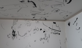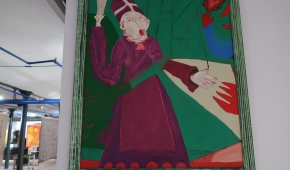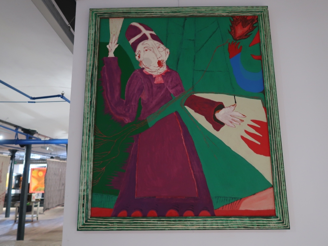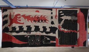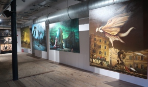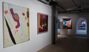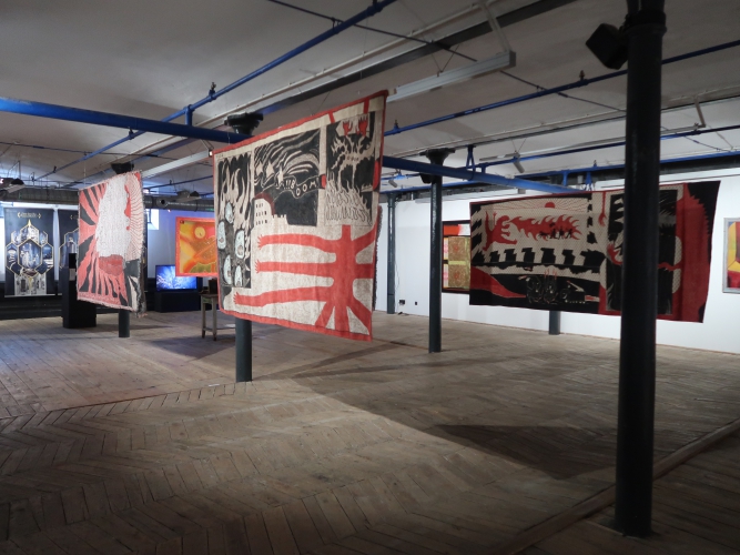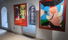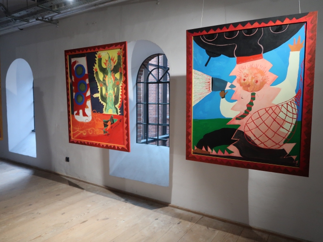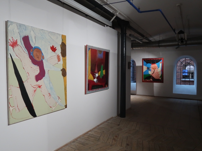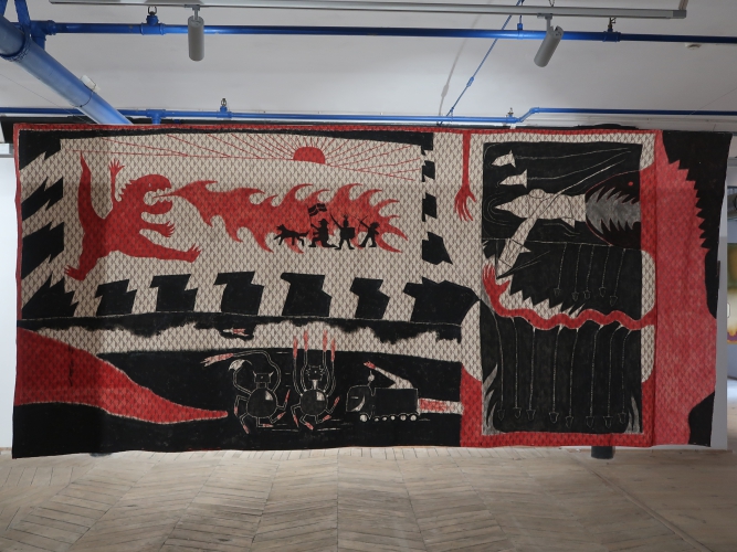 Drugi koniec sali niemal w całości wypełnia rozbudowany dyplom Ignacego Tybora – według mnie jedna z najlepszych propozycji na tej wystawie. To seria sporych, wściekle kolorowych obrazów przedstawiających fantazyjny świat oraz cykl wielkich rysunków z uproszczonymi postaciami, w oszczędnych, biało-czarno-czerwonych barwach. Wszystkie one opowiadają o sytuacjach konfliktowych. Jest tu przemoc, śmierć, są rakiety, żołnierze, jest smok ziejący ogniem.