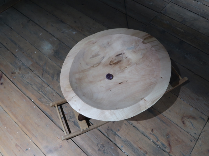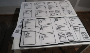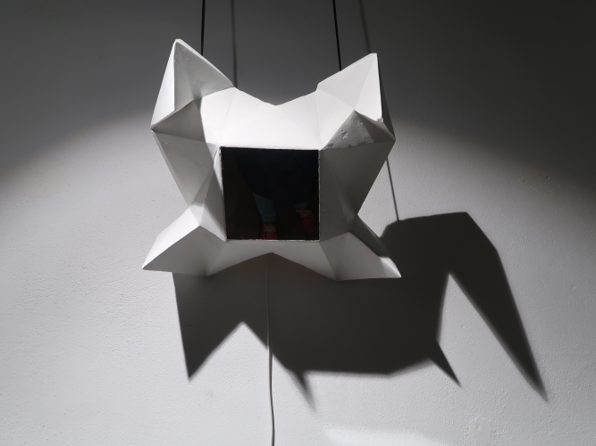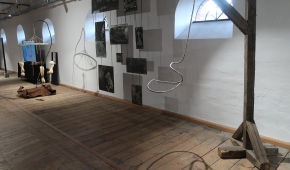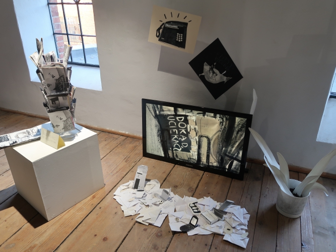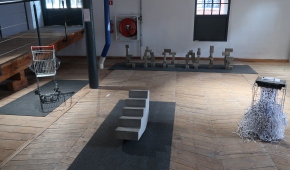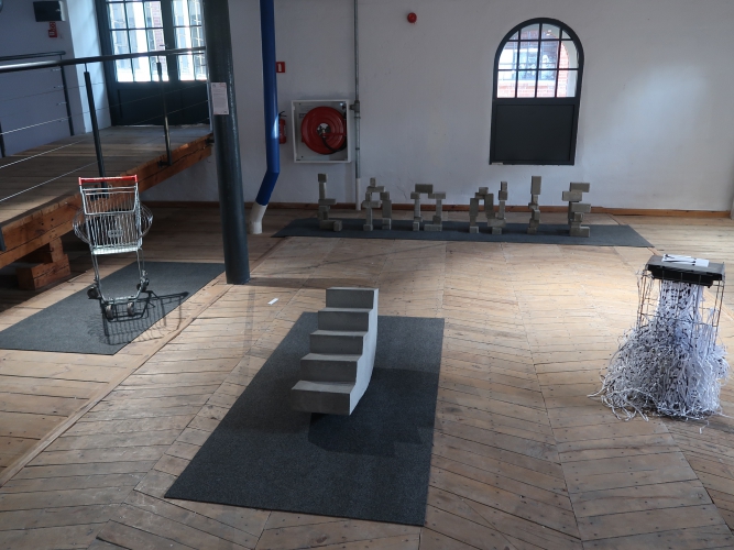W drugiej hali na tym samym piętrze umieszczono prace magisterskie zupełnie innego typu, z drugiego końca „skali”, inspirowane w większości surowością materii, jej prawdą, modernistyczną prostotą. Uwagę zwracają wymowne rzeźbiarskie obiekty Sławomira Lewego: sklepowy wózek z prętami wygiętymi od nadmiaru przewożonych nim niegdyś produktów, niszczarka, z której wylewa się kaskada pociętego papieru z długiej taśmy z napisem „WSPÓLNIEWSPÓLNIEWSPÓLNIE…” albo betonowe schody na zaokrąglonym jak w kołysce spodzie – próbując wejść na górę, opadamy. To inteligentna, a zarazem dowcipna wypowiedź na temat symbolicznej przemocy – opresyjności komunikatów i haseł w przestrzeni publicznej, przekonywania, że szczęście wiąże się ze statusem ekonomicznym. I kolejny z moich ulubionych zeszłorocznych dyplomów.
