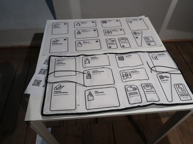 Pomocna w sytuacjach stresowych, gdy mamy ograniczoną zdolność skupienia, może być apteczka pierwszej pomocy według projektu Natalii Biernat – czarno-biała, z opisanymi przegródkami na poszczególne elementy wyposażenia.