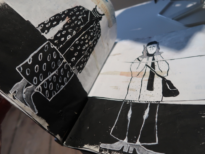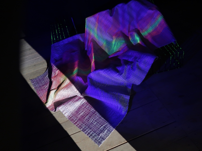 Marta Chrobak, także za pomocą nadruków na tkaninie, opowiedziała o swoich uczuciach i myślach, jakie towarzyszyły jej w ciągu ostatnich lat. Duże, wiszące płachty materiału wyglądają jak przeskalowane ilustracje książkowe. Zobaczenie samej siebie w takiej skali może pomóc zrozumieć swoje odczucia, jakoś je uporządkować. Podobnie arteterapeutyczną funkcję może pełnić inny projekt tej autorki – wypełniony fioletowym światłem pokój z prostokątnymi płachtami tkaniny i umieszczonym pośrodku kołem z pozszywanych wyrazistym ściegiem „ścinków”, po którym powoli ślizga się białe światło sugerujące jego kulisty kształt. Wyobraźnia podpowiada, że to planeta (może Ziemia i jej kontynenty) na ciemnofioletowym nieboskłonie. Ta scenografia sprzyja medytacji lub choćby wyciszeniu.