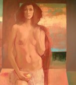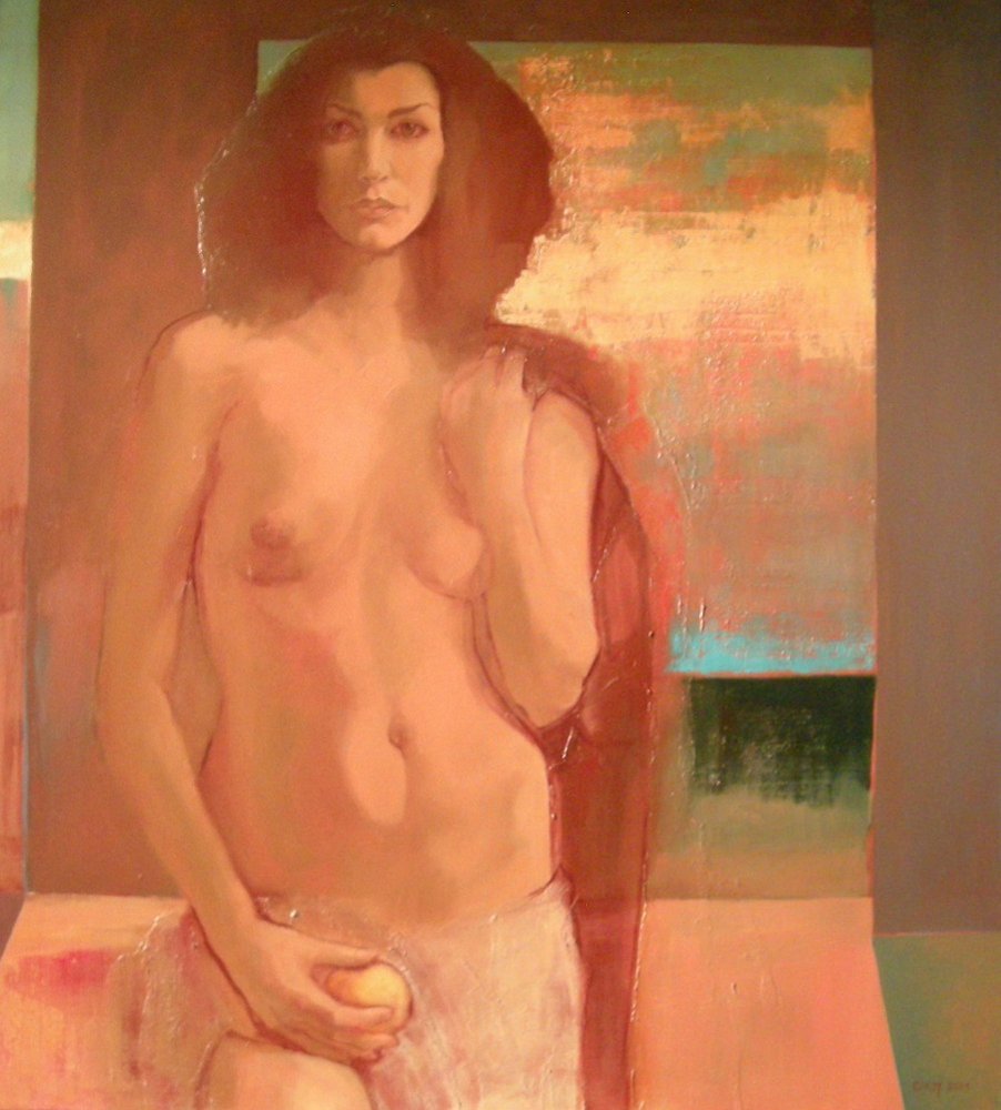 Marcin Jaszczak (1975) maluje kobiece akty na abstrakcyjnym tle. Te obrazy mają nieco secesyjny klimat.