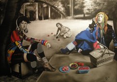Karolina Matyjaszkowicz (rocznik 1980) maluje bardzo ciekawe obrazy przypominające nieco malarstwo prymitywne. Inspiruje ją świat z ludowych podań: diabły, anioły, kościotrup, symbole, metafory.