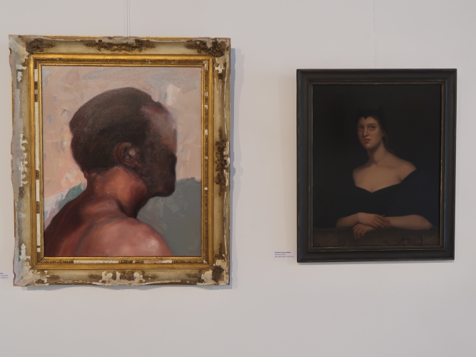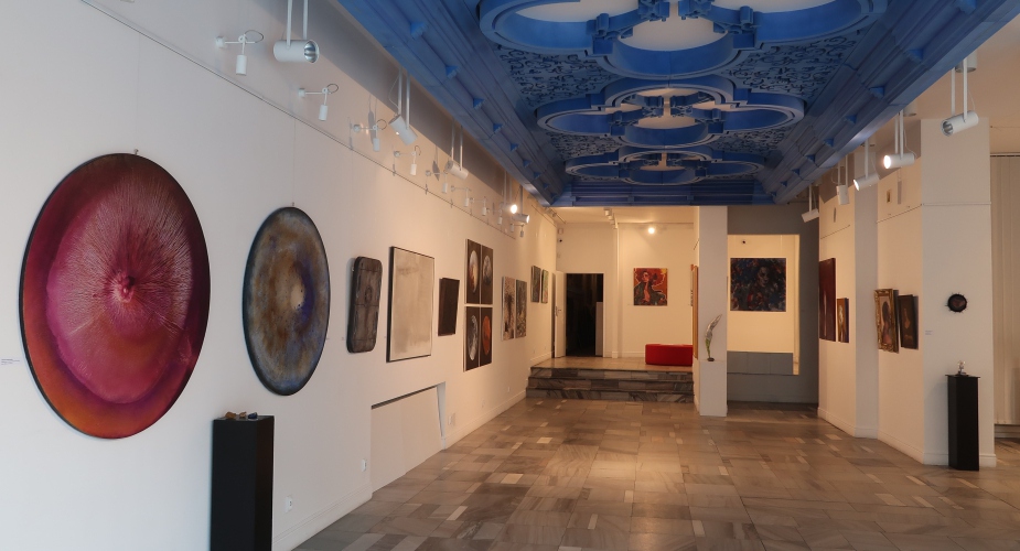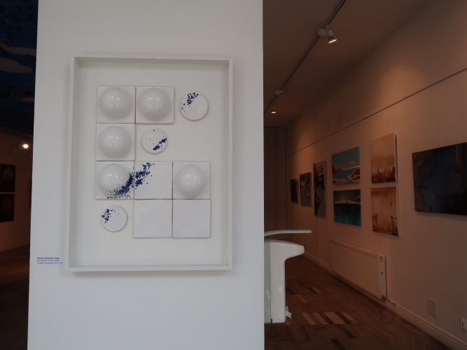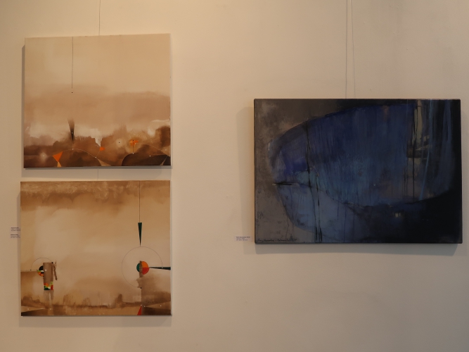 Dwa abstrakcyjne obrazy Wojciecha Kalety przyciągają wzrok nietypową, brązową kolorystyką i interesującymi formami. Podobnie zwraca uwagę abstrakcyjne płótno Sylwii Szyszkowskiej-Sitarek z błękitną formą przypominającą kształtem głowę walenia.
