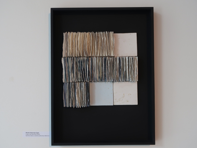 Intrygują dwa ceramiczne reliefy Moniki Kubiaczyk-Cygan. Pierwszy to kompozycja białych kafelków: płaskich – kwadratowych i okrągłych oraz kwadratowych z półokrągłą wypukłością, z bielą przełamaną dynamicznym granatowym rozpryskiem farby. Drugi – zestaw jasnych kwadratowych kafelków skontrastowanych z postawionymi gęsto na sztorc jak książki na półce ceramicznymi „kartkami papieru”.