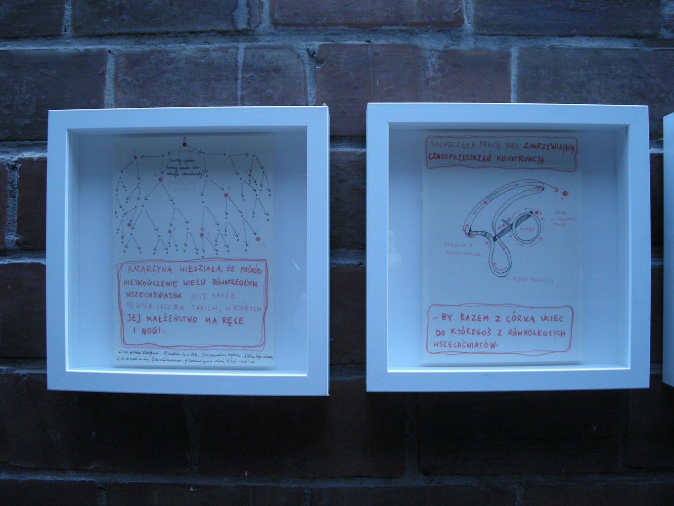 Studentka Maria Korczak-Idzińska pozwoliła sobie na formę lekką i niecodzienną, jeśli chodzi o nawiązania do Kobro i – mimo swej skromności – efektowną. „Skok w nadprzestrzeń” to pięć rysunków przedstawiających alternatywne życie wielkiej artystki, która w tej wersji życiorysu bada formy (opracowuje konstrukcję zakrzywiającą czasoprzestrzeń) w celu zbudowania pojazdu, który pozwoli jej wraz z córką opuścić rzeczywistość i ulecieć do któregoś z równoległych wszechświatów. Powstała ciekawa legenda, odwołująca się jednocześnie do sztuki i życia Kobro. Bo też postać tej awangardzistki jest dla dzisiejszych twórców raczej legendarna.