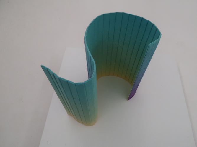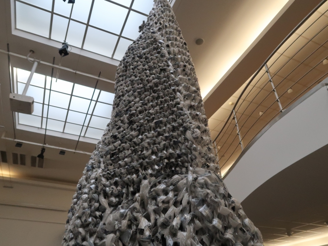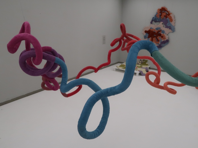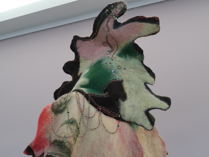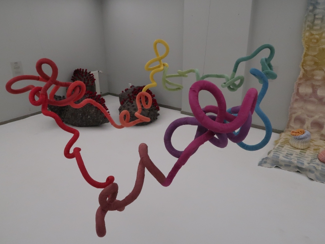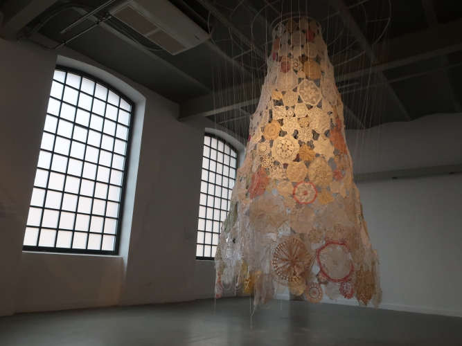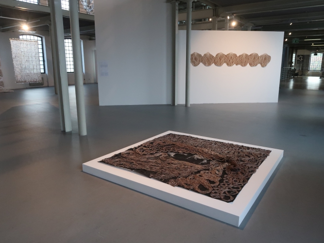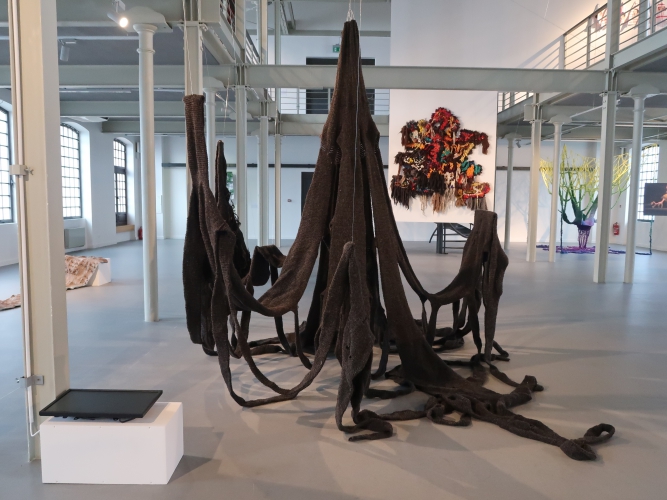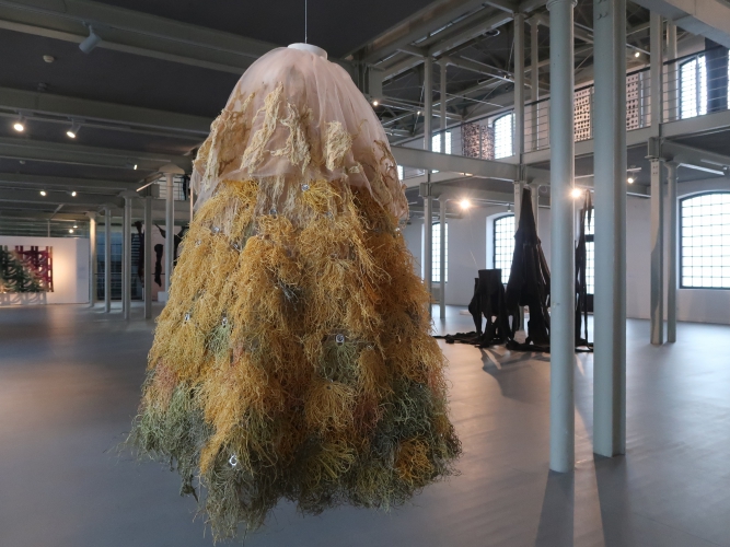 Jak wspomniałam, porównać tych dwóch wystaw nie można. Ale wskazać ciekawszą – owszem. To główna ekspozycja Międzynarodowego Triennale Tkaniny. Zaskakująco lekka pod względem wizualnym, pełna przestrzeni i – choć wypełniona wielogłosem różnorodnych wypowiedzi – nieprzegadana. Mimo mnogości prac nie męczy. Już poprzednia edycja triennale, które zorganizowano inaczej niż wszystkie dotychczasowe: wystawę powierzono kuratorce (tej samej, co tym razem: Marcie Kowalewskiej) i opatrzono hasłem przewodnim, grupując prace wedle problematyki – pokazała, że tego typu prezentacja nie musi widza przytłaczać, że może stać się dla niego przygodą, poszerzyć jego horyzonty. Tak jest również teraz.