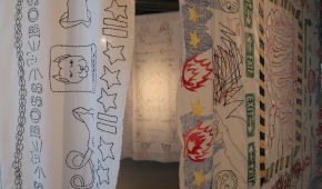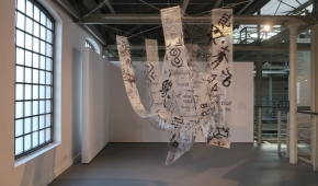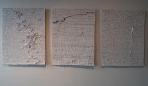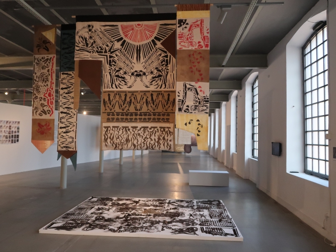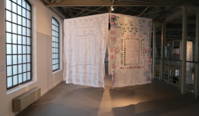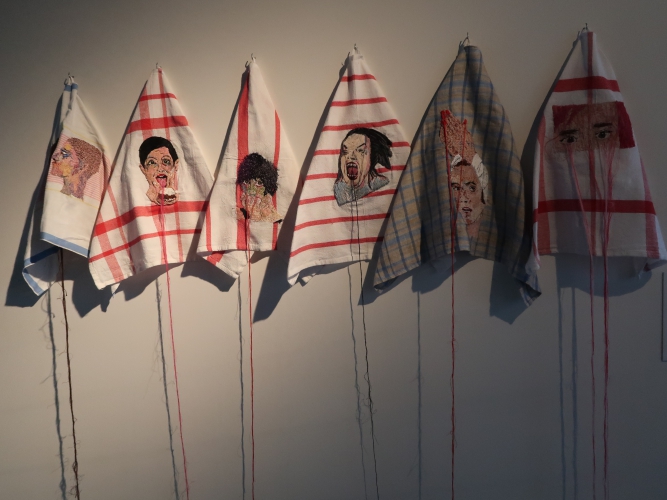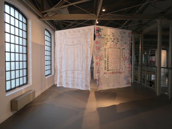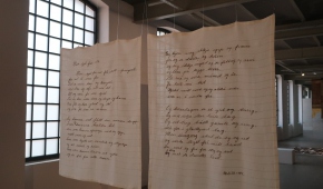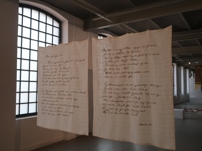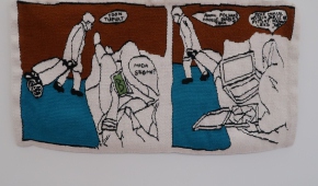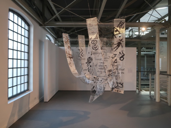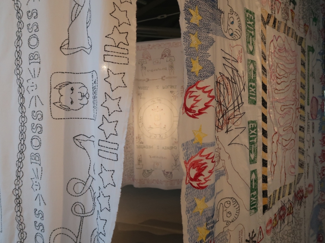 W tym rozdziale mieści się też przekaz Aoi Tashiro z Japonii („Autoportret I II III”), która w formie białego tryptyku wyplata swoją biografię z paragonów – znaków konsumpcji. I kolekcja obrusów Moniki Drożdżyńskiej („Dobrze/дoьpe/good”) – ręcznie haftowanych esejów, w których koegzystują teksty, znaki i obrazy. Symbole i ornamenty: litery różnych alfabetów, logotypy, gesty, znaki drogowe. Pomieszanie, nagromadzenie. Cały świat sprowadzony do jednego, płaskiego wymiaru. Przebodźcowanie informacjami, chaos.