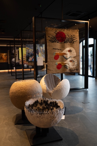Czterdzieścioro twórców zostało zaproszonych do udziału w tej części wystawy – wyboru dokonał Norbert Hans, nauczyciel i mentor wielu z nich. Każdy mógł pokazać dwie prace, co zaowocowało nie tylko różnorodnością (tytułową wielogłosowością), ale i pewnym przeładowaniem ekspozycji. W efekcie dzieła zaczęły ze sobą konkurować, wchodzić w niezamierzone relacje. Odbiór subtelnych obiektów Izabeli Wyrwy, sytuujących się na pograniczu tkaniny, rzeźby i rysunku, zakłóciło zbyt bliskie sąsiedztwo feministycznej rzeźby autorstwa Lindy Lemon. Klepsydra złożona z dwóch połączonych szklanych macic, pomiędzy którymi przelewa się woda, pasowałby raczej do dzieła Libery, mogłaby stanąć przy wejściu i odmierzać czas zwiedzania. Wtedy można by sprzedawać bilety czasowe, jak w komunikacji miejskiej – taka moja fantazja. Swoją drogą Linda Lemon pokazała też bardzo ciekawy autoportret z macicą (pod postacią kwiatu) w tytule, który skojarzył mi się z twórczością Magdy Moskwy. Odkryciem były też dla mnie prace Martyny Karczewskiej, Laury Jerzak i wspomnianego już Norberta Hansa. Zawarte w jego obrazach aluzje do historii sztuki i estetyki atlasów przyrodniczych mogą być rozumiane jako metafora tworzenia kolekcji. Czy nowa galeria stanie się początkiem lokalnej mody na sztukę? Czy prywatny mecenat jest receptą na kulturalne ożywienie mniejszych ośrodków?