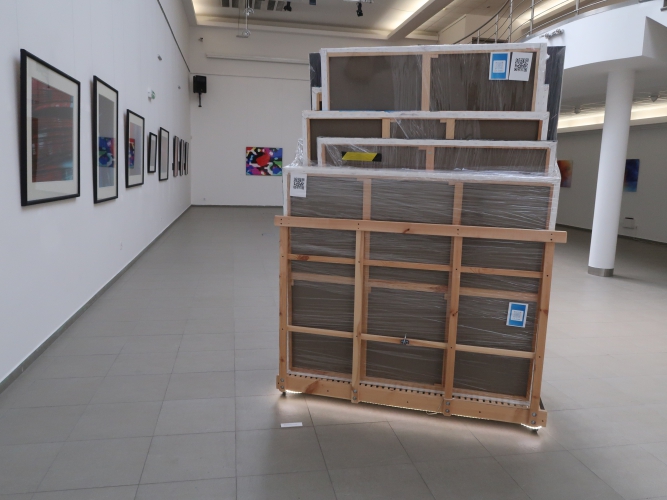 W OPS znalazła się jedna przestrzenna instalacja (nie liczę prac Omuleckiego, które przywierają do ściany) i to całkiem niecyfrowa – cyfrowe są tylko kody QR, którymi ją oznaczono, odsyłające do profilu artysty na Instagramie oraz do jego strony internetowej. Witold Ziemiszewski wystawia obrazy, których nie można zobaczyć. Stoją ściśnięte w skrzyni magazynowej, widzimy tylko ich tyły. To intrygujące i niepokojące jednocześnie.